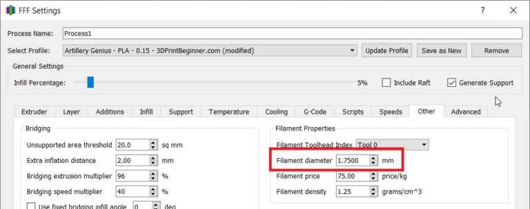 В Simplify 3D вы устанавливаете диаметр нити на вкладке ''Другое'' в процессе печати. Это находится в разделе ''Редактировать настройки процесса'' – ''Другое''.