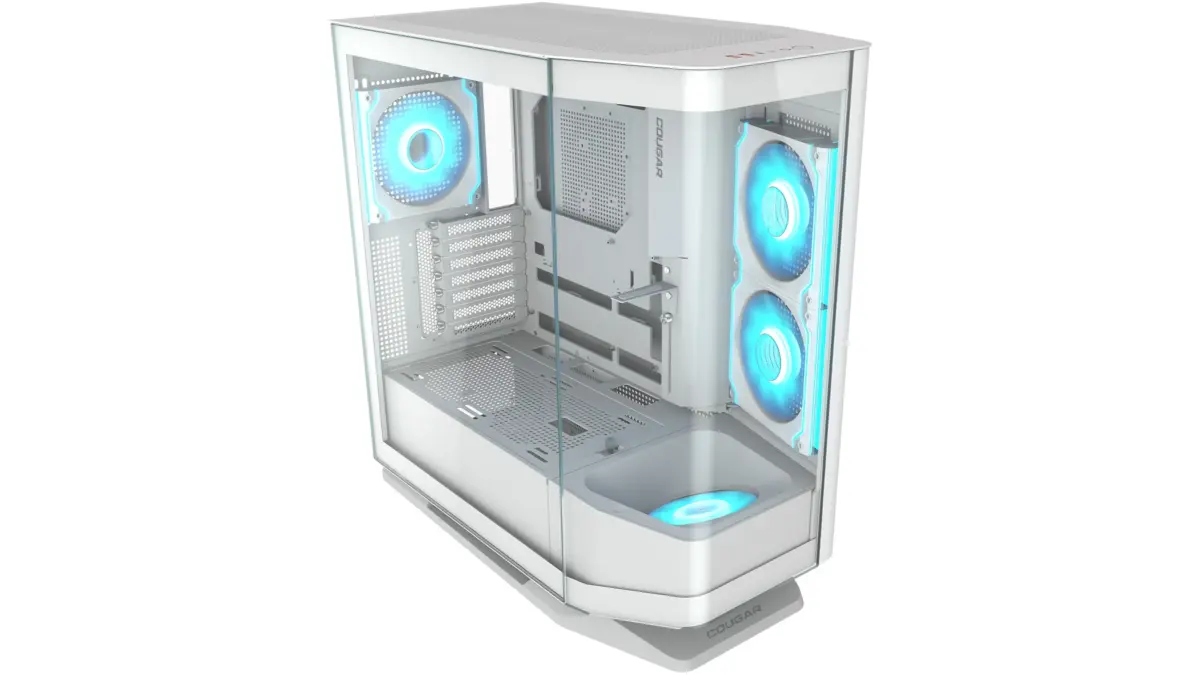 Cougar FV270 RGB White делает ставку на максимальную визуальность: изогнутое закалённое стекло создаёт панорамный обзор сборки, а угловая установка вентиляторов улучшает движение воздушных потоков. Внутри предусмотрена поддержка крупных видеокарт и Е-ATX-плат, что делает модель подходящей даже для топовых конфигураций.