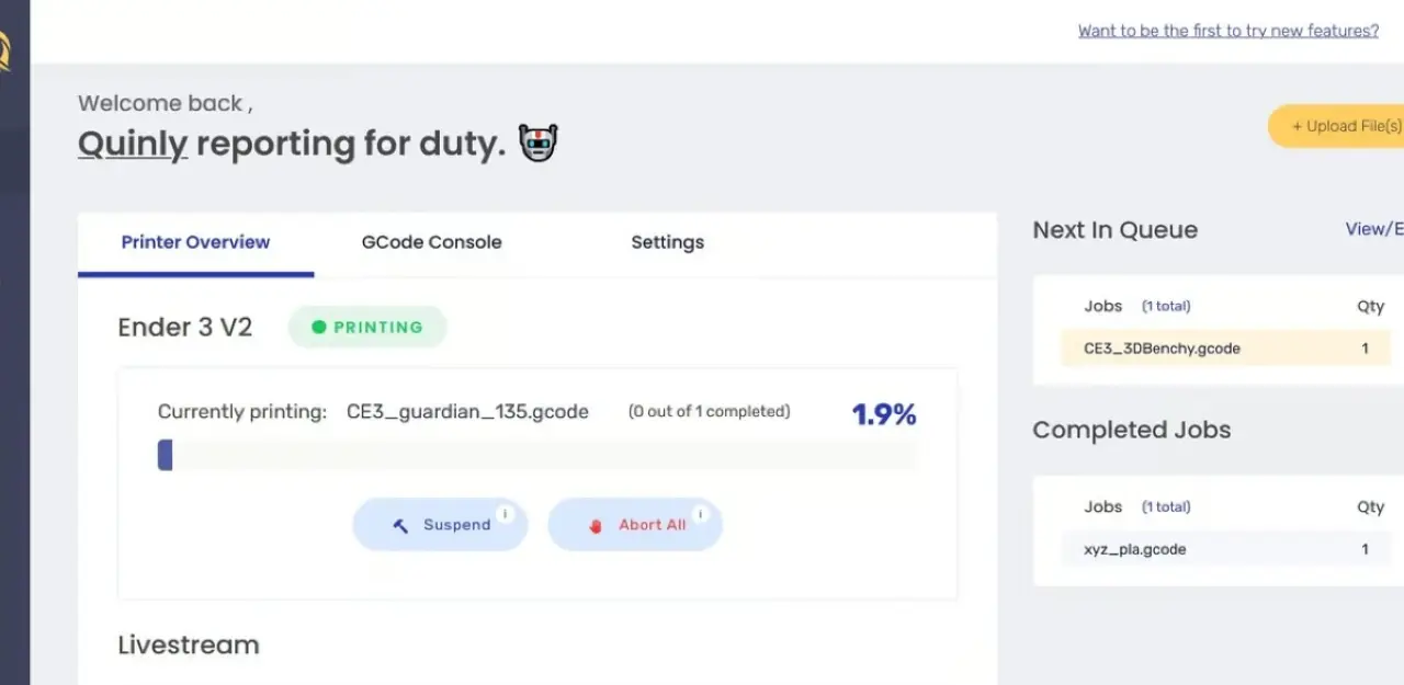 Если оператор хорошо обслуживает 3D-принтер, то устройство выполняет печать без сбоев. Это делает Quinly лучшим вариантом для печати с большой очередью. В пользовательском интерфейсе отлично продуманы все параметры, также стоит отметить систему папок G-кода. Несмотря на это, в Quinly практически нет опций, кроме поставки изделий в очередь и указания температуры для запуска очистки беда. Еще разработчики упустили возможность упростить процедуру обслуживания и типичные операции.