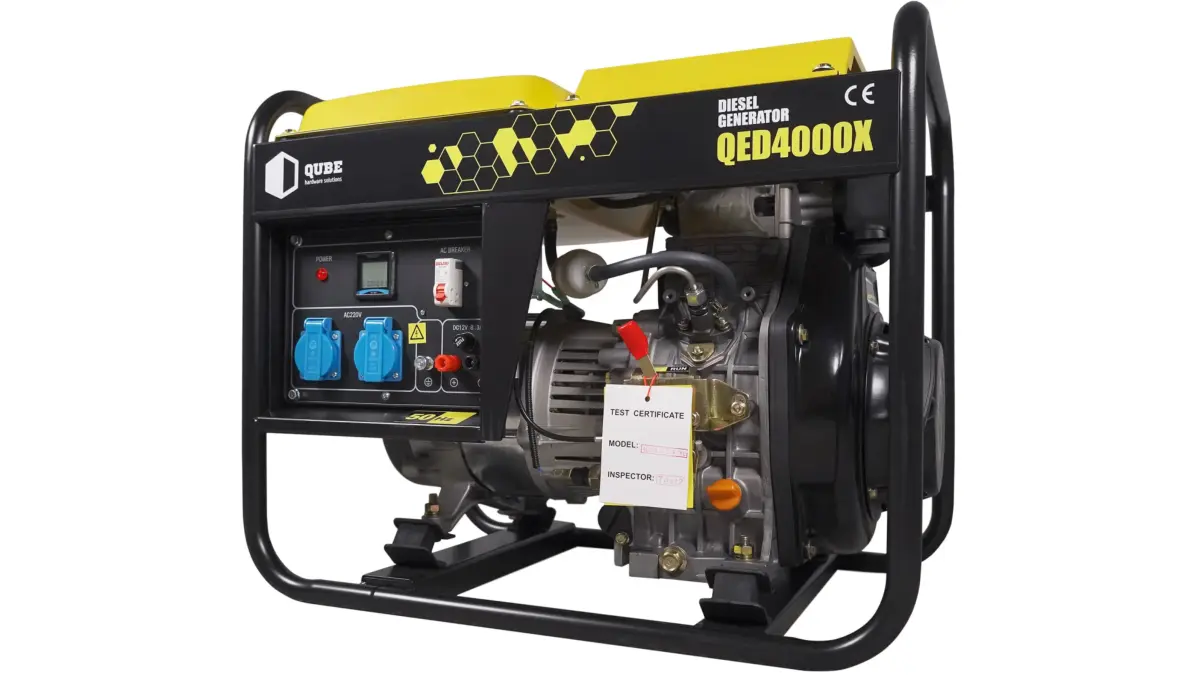Qube QED4000X – дизель, номинальная мощность 2,6 кВт, максимальная 3,0 кВт. Выдаёт 220 В, бак 12,5 л, запуск – ручной. Уровень шума 72–77 дБ, вес 77 кг. Компактный, использует медную обмотку и защищён по стандарту IP23.