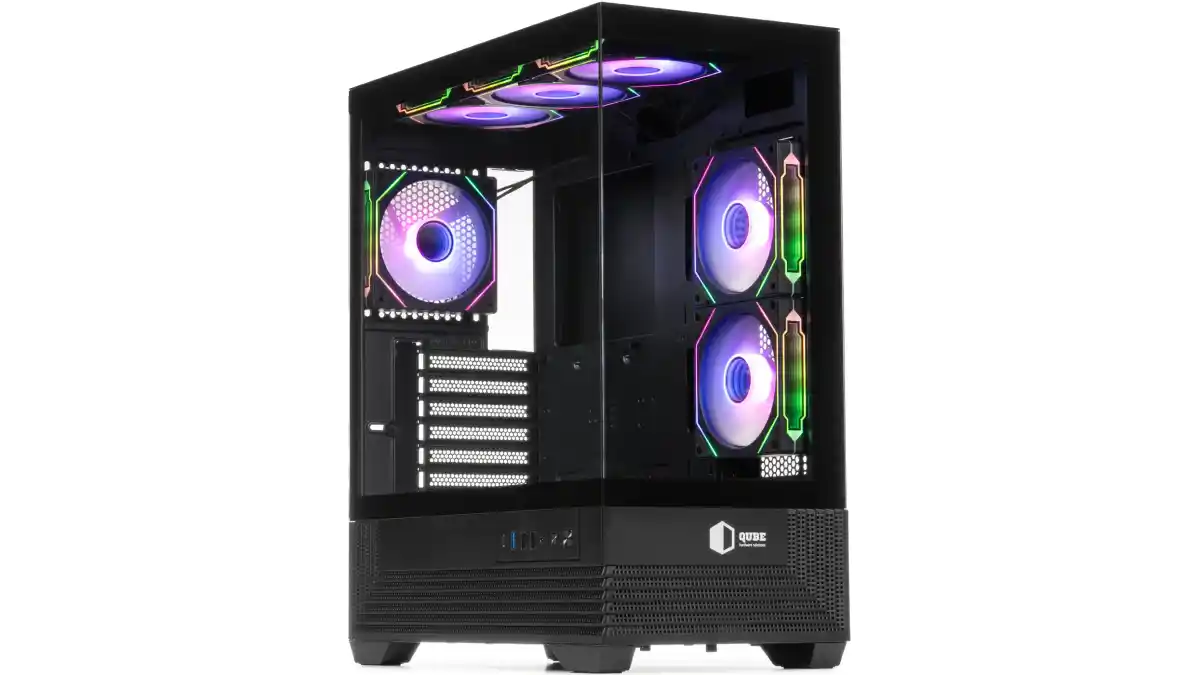 | QUBE FORT ARGB Black | Middle Tower | 390 мм | 165 мм | Steel 0.7 мм / Tempered Glass | USB-C + USB 3.0 + 2×USB 2.0 + Audio | Side 5×120 мм + Top 3×120 мм + Rear 1×120 мм |