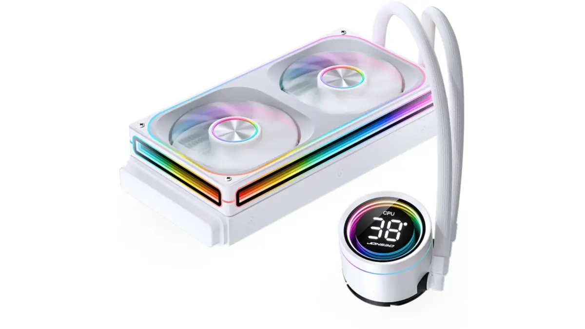 Jonsbo TH-240 White – СЖО с LCD-дисплеем на насосе, отображающим температуру CPU. Вентиляторы с диапазоном 700-2400 об/мин адаптируются под разные сценарии. Белый корпус и ARGB-подсветка создают аккуратную визуальную сборку.