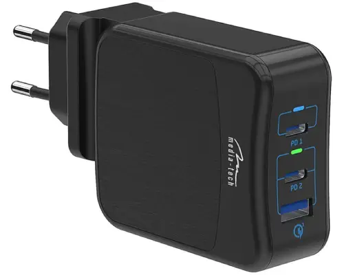 Один из лучших мобильных аксессуаров Media–Tech на данный момент – Зарядное устройство Media–Tech 2xUSB–C PD 65W, USB QC 3.0 Black (MT6252):