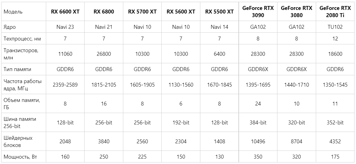Для того чтобы вы наглядно смогли сравнить видеокарту AMD Radeon RX 6600 XT с её аналогами и конкурентами, мы предлагаем ознакомиться с таблицей ниже. В ней указаны основные характеристики, напрямую влияющие на производительность моделей и их результативность в задачах, связанных с обработкой графики.