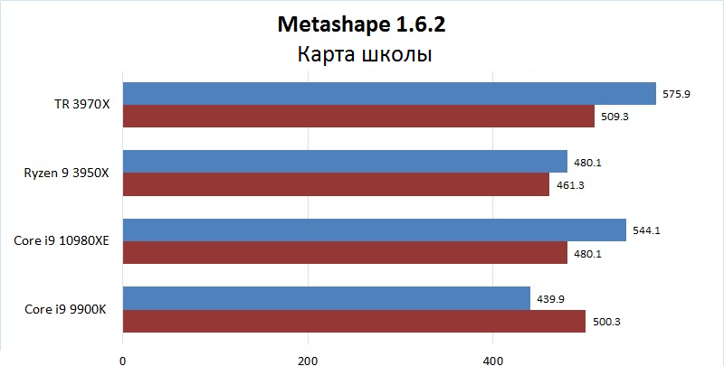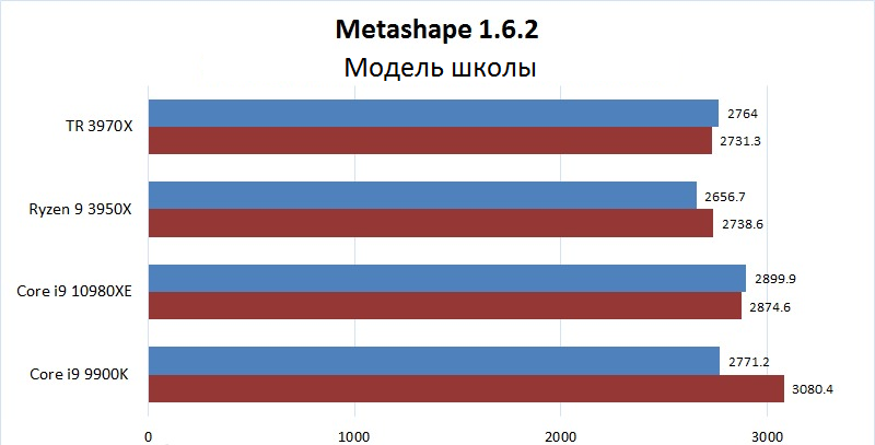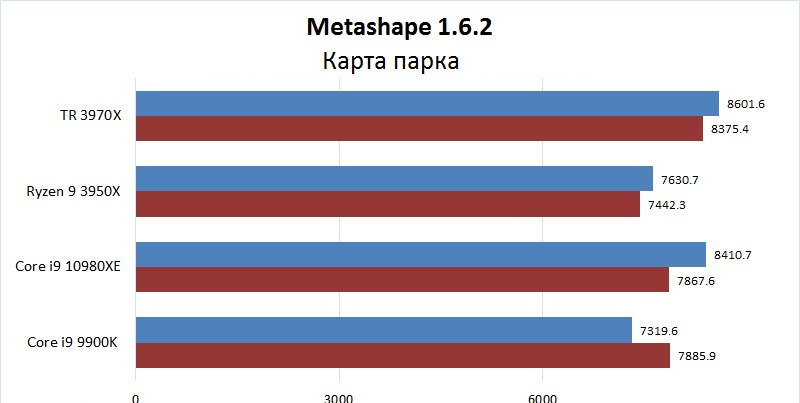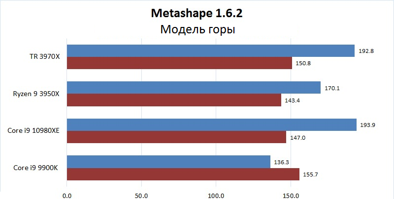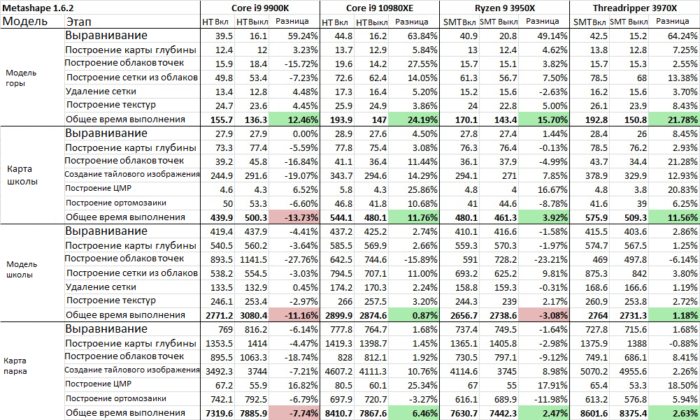 В 3 из 4 процессоров, которые мы тестировали, а именно, Core i9 10980XE, Ryzen 9 3950X и Threadripper 3970X, отключение многопоточности повысило производительность в Agisoft Metashape. Иногда это повышение было весьма существенным, иногда меньшим. Однако, несмотря на то, что эти процессоры являются одними из самых быстрых во многих приложениях, они не справляются с Metashape и уступают Core i9 9900K. Эта модель был единственной в этом наборе тестов, которая выиграла от включения HT.