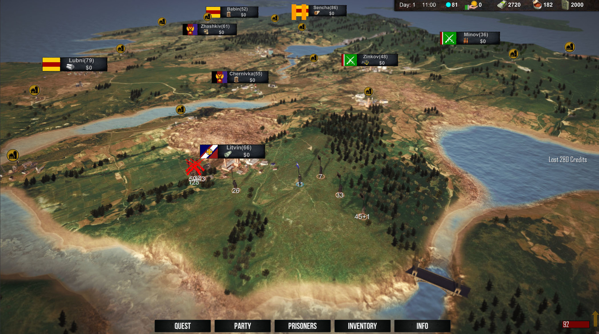 В начале игры мы создаем собственного персонажа, парня или девушку, настраиваем критерии его внешности и основываем собственную группировку, попутно выбирая имя и флаг. Тут можно попетросянить, фантазируя наиболее дерзкие названия даже на русском. После мы появляемся на глобальной карте, где уже рыскают различные группировки. На старте у нас есть тысяча долларов. Отправляемся в ближайший город, чтобы нанять себе хоть какую-нибудь бригаду бойцов. За штуцер, конечно, нанять элитную бригаду не выйдет, поэтому обзаводимся стартпаком из бомжей. Посмотреть можно численность отряда, его вооружение и уровень. После отправляемся искать наиболее легкую добычу.