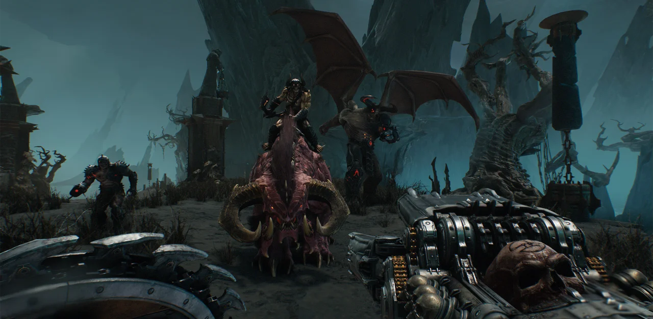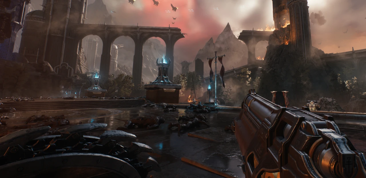 Если в прошлых играх модельки врагов были лишь косметически переработаны, в Dark Ages многие из них получили новые поведенческие паттерны, которые повысили уровень их интеллекта и сделали их более опасными. И хотя архетипы сохранились, ощущается это всё как битвы с новыми недоброжелателями. Увеличилось и их количество за счёт увеличения арен. Больше никаких клаустрофобных коридоров на космических кораблях и в различных руинах. Dark Ages дарит огромные открытые пространства, населённые демонами, с кучей загадок и секретов, тайных троп и ценных наград. Уровни получились реально огромными, местами правильный путь ищешь дольше, чем дерёшься с чертями. Антураж гротескного средневековья — мёд для глаз. Игра получилась настолько стильной в плане сеттинга, что местами забываешь, что ты вообще в DOOM. Особенно такую память стирают уровни на драконе. Если в предыдущих частях каждый следующий уровень почти ничем не отличался от предыдущего в плане гейм- или левел-дизайна, то Dark Ages решила отойти от такого канона в сторону большего разнообразия. Каждый следующий уровень дарит тебе какую-то новую механику и свежий взгляд на этот мир: раз ты стрелял демонов, два — ты уже летаешь на драконе над огромным городом, зачищая таверы — привет Divinity! Три — и ты уже в огромном роботе топчешь под собой танки, мосты и демонов! И самое крутое, что такие эксперименты очень сильно меняют геймплейные основы. Находясь в теле робота, к примеру, вы не можете парировать удары, потому что здесь всё работает на уклонениях и энергии за них. За дракона тоже есть мини-игра с уклонениями вправо, влево, вверх и вниз. Каждая следующая локация пытается казаться другой, даря глазам тепло красивого графического уровня, а тебе — душевный покой благодаря почти идеальной оптимизации. Всё же такая оптимизация имеет цену — Dark Ages не поиграешь на видеокарте, у которой меньше 8 гигабайт видеопамяти. Игра съедает почти все восемь, но работает без каких-либо нареканий.