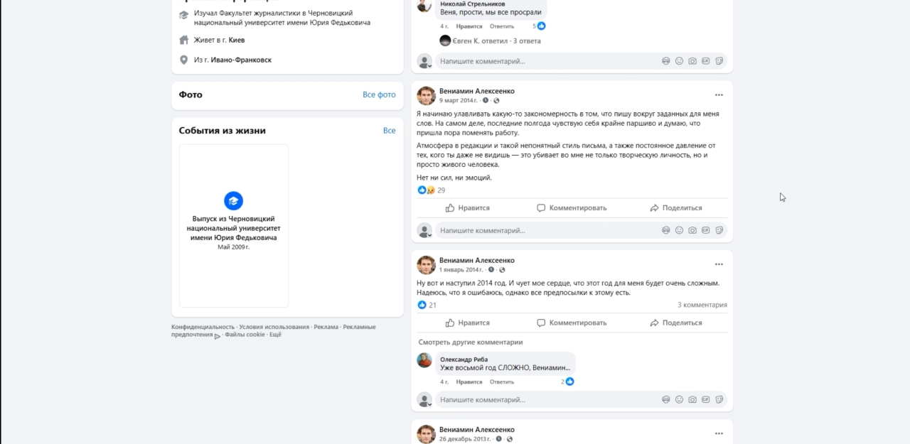 Чтобы разогнать загадки ещё круче, GSC создали Вениамину фейковый профиль в Facebook, в котором тот постил всякое будто из своей реальной жизни ещё в 2013–14 годах. На странице можно найти пасхалки с именем главного героя, НИИЧАЗ и другими. История такая: Вениамин Алексеенко родом из Ивано-Франковска и учился на факультете журналистики в Черновицком национальном университете имени Юрия Федьковича. Так как я тоже учился в ЧНУ, но на филологическом, скажу, что никакого факультета журналистики там нет — есть лишь одна небольшая кафедра и 2 группы, 98% процентов студентов которых — платники. После этого наш Вениамин переезжает в Киев и устраивается в редакцию. Работа его не прикалывает, так как постоянно говорят, что писать, поэтому он вспоминает старую историю, которую рассказывали где-то в сквере перед ЧНУ, так как никаких курилок там нет — похоже, GSC никогда не посещали ЧНУ. Вениамин вспоминает о том, как где-то в нулевых группа студентов из универа пошла в Зону и исчезла. Он начал собственное расследование и наткнулся на кое-что интересное. В последнем посте Веник говорит, что идёт в Зону, а именно — в НИИЧАЗ, потому что именно там сможет получить определённую информацию. Выходит, тело Журналиста действительно нашли в бункере под Яновом? На самом деле нет, так как Вениамин инсценировал собственную смерть. Сам он занялся куда более крутым поиском, да таким, что его расследование привлекло внимание Шрама, Коршунова и Стрелка.