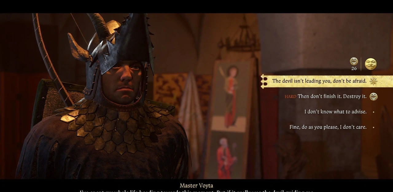 Вернувшись, художник дополняет историю деталями, а потом просит нас помочь ему с церковным заказом. Мы должны отправиться к предыдущему заказчику, который не заплатил, и забрать у него плату — драгоценный камень. Просто выманить камень не получится, поэтому я его попросту украл. Художник становится всё более странным. Он всё чаще разговаривает сам с собой, а затем и вовсе говорит, что с ним уже давно говорит дьявол. Всё это из-за того, что он сделал — будто смерть его друга лежит на его совести. Именно из-за этого наш господин и бродил тогда по лесу, чуть не поймав стрелу. Он хотел найти Буркгарта и убить собственноручно, чтобы отомстить за друга, но под руку подвернулись кости, вино и дураки. Войтех говорит, что есть одно зелье, которое поможет заглушить голоса в голове. Мы собираем ингредиенты и варим этот чудо-отвар — процесс, к слову, настоящая морока, потому что в нём много мелких хитростей. Всё же Генри отдаёт художнику отвар, но тот не помогает. Говорит, что злые силы его не отпускают, будто он им что-то должен. Только когда он работает, голоса затихают, поэтому он хочет поскорее закончить церковный алтарь. Для этого ему не хватает одной статуэтки Богоматери, которую должен был доделать местный плотник. Квест разветвляется — его подмастерье украл статуэтку, так как плотник мало платил, и решил продать её на чёрном рынке бандитам. Мы разыскиваем парня, убиваем бандитов и приносим статуэтку художнику. Войтех снова вспоминает о дьяволе и задаётся вопросом: «Если я закончу картину — покинет ли меня дьявол?»