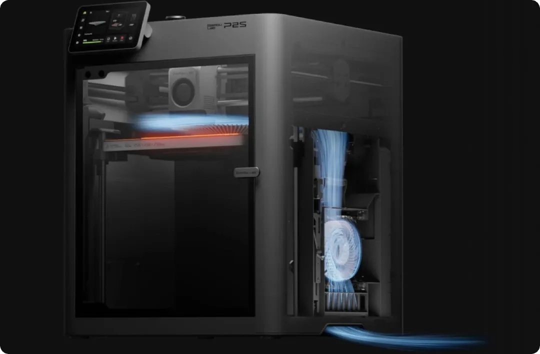 Одной из ключевых особенностей Bambu Lab P2S является система Active Flow Dynamics, которая автоматически калибрует поток материала, обеспечивая чистоту и непрерывность процесса печати. Система Adaptive Airflow добавляет еще один уровень контроля, регулируя воздушные потоки для оптимальной работы с различными видами филамента. Эти улучшения делают P2S идеальным выбором для сложных проектов, где требуется высокая точность и качество исполнения.
