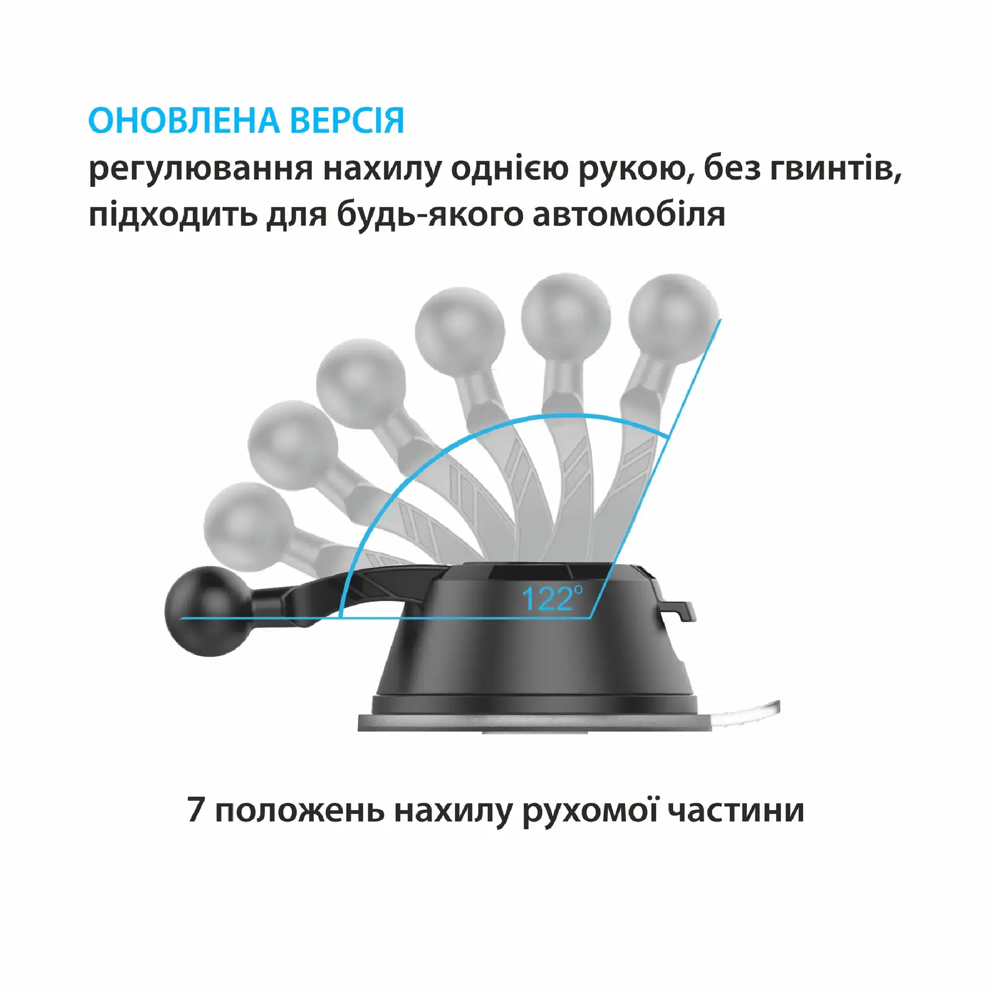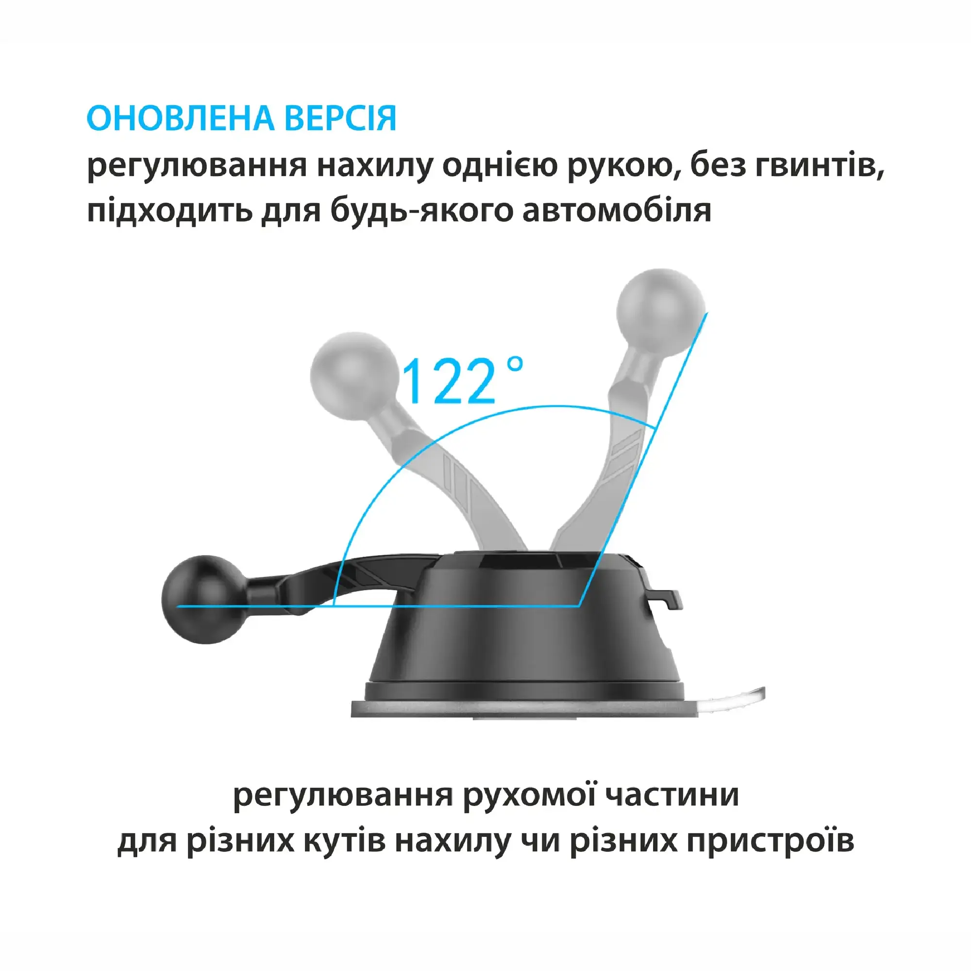 - Легкая установка: крепление легко устанавливается на лобовом стекле или панели автомобиля и фиксируется присоской с зажимом и гелевой клейкой основой.
