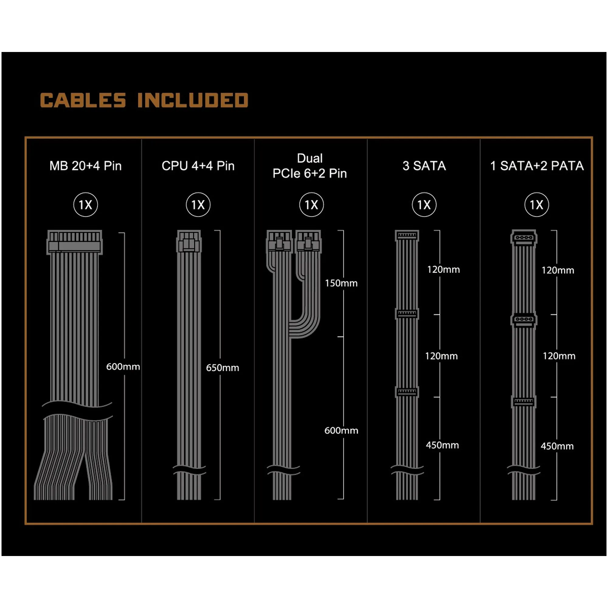 - Длина кабелей для питания материнской платы/процессора/видеокарты/SATA, см