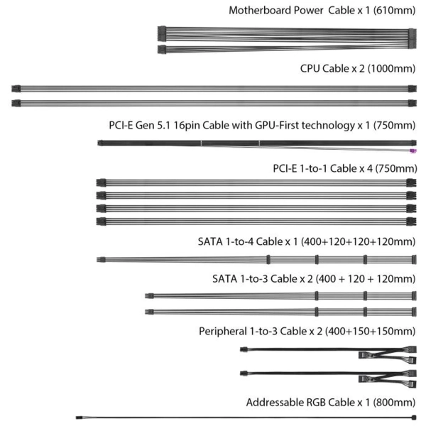 - Длина кабелей для питания материнской платы/процессора/видеокарты/SATA, см