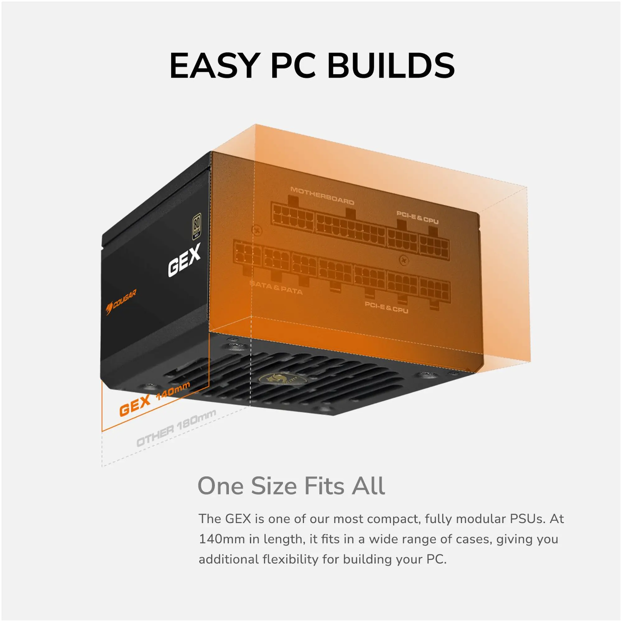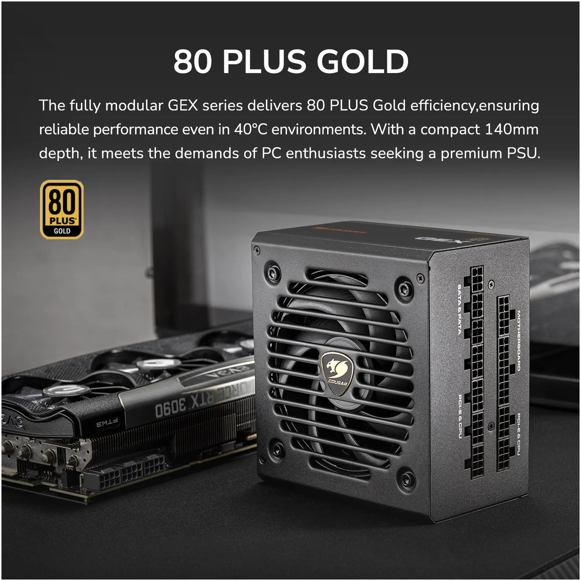 Блок питания Cougar GEX 650 представляет собой сбалансированное и премиальное решение мощностью 650 Вт с сертификатом 80 PLUS Gold, который гарантирует высокую эффективность даже при температуре до 40 °C. Среди ключевых особенностей этой модели — полностью модульная конструкция кабелей, что упрощает сборку и улучшает вентиляцию внутри корпуса, а компактная глубина всего 140 мм позволяет использовать его в более узких корпусах без компромиссов по производительности. Эффективность преобразования энергии достигает порядка 91 %, что снижает потери и тепловыделение при нагрузке.