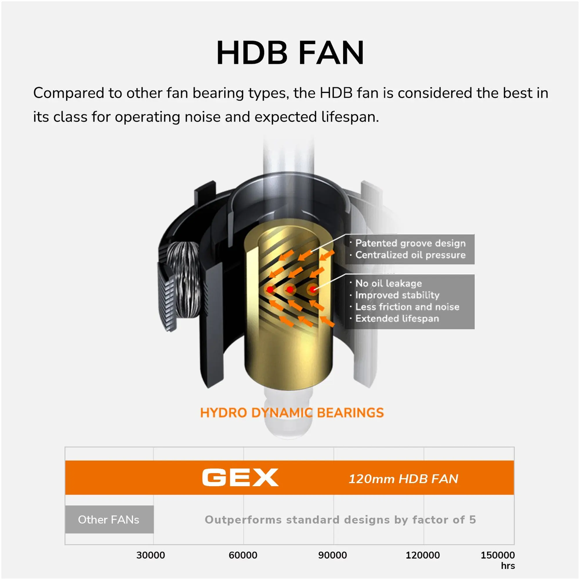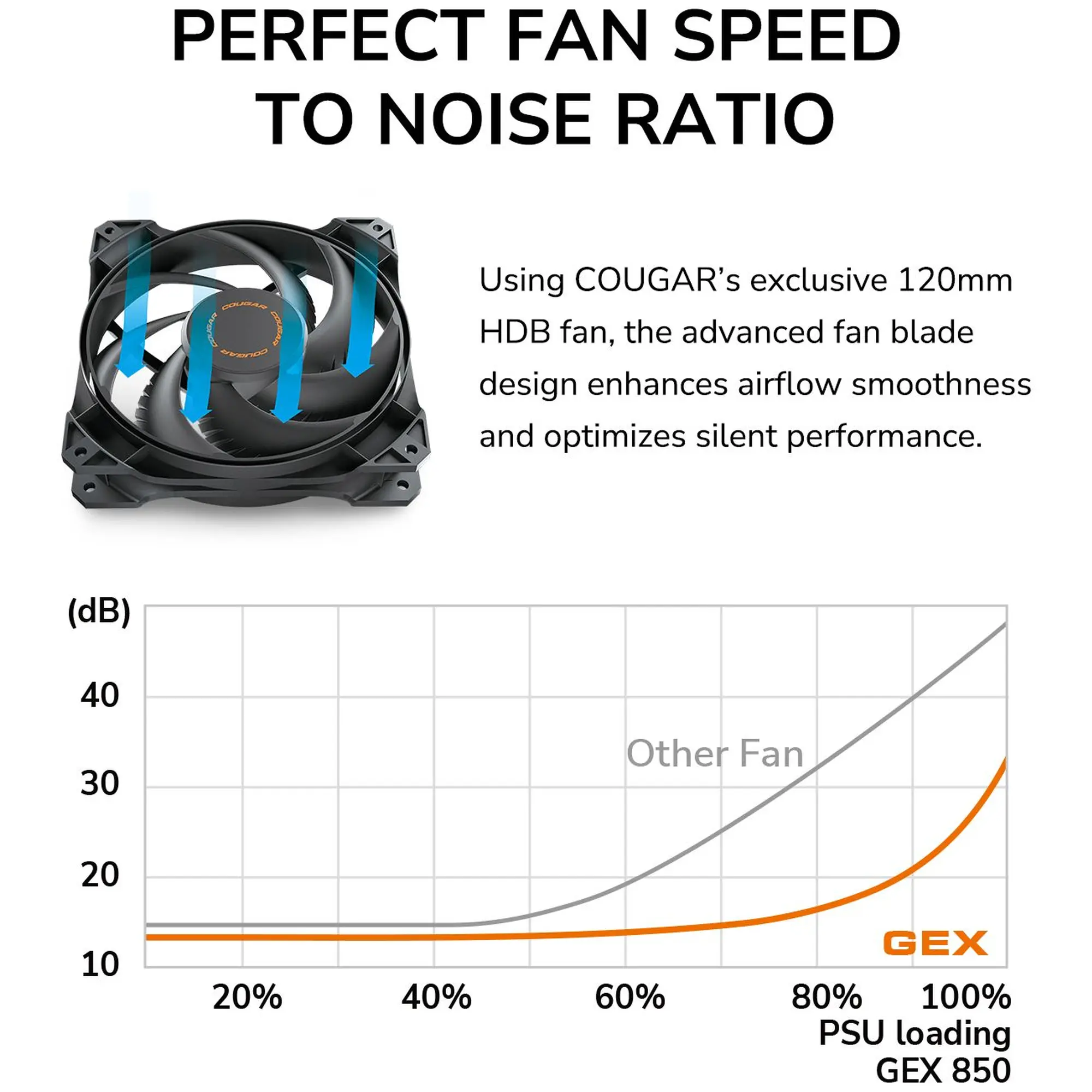 Cougar GEX 650 оборудован тихим 120-мм вентилятором с гидродинамическим подшипником (HDB), оптимизированным для плавной работы. Лопасти вентилятора с улучшенной геометрией и стабилизирующим кольцом уменьшают турбулентность и уровень шума, сохраняя при этом достаточное охлаждение при высокой нагрузке. Внутри блока используются японские конденсаторы, рассчитанные на температуру до 105 °C, что повышает надёжность и долговечность компонентов даже при длительной эксплуатации.