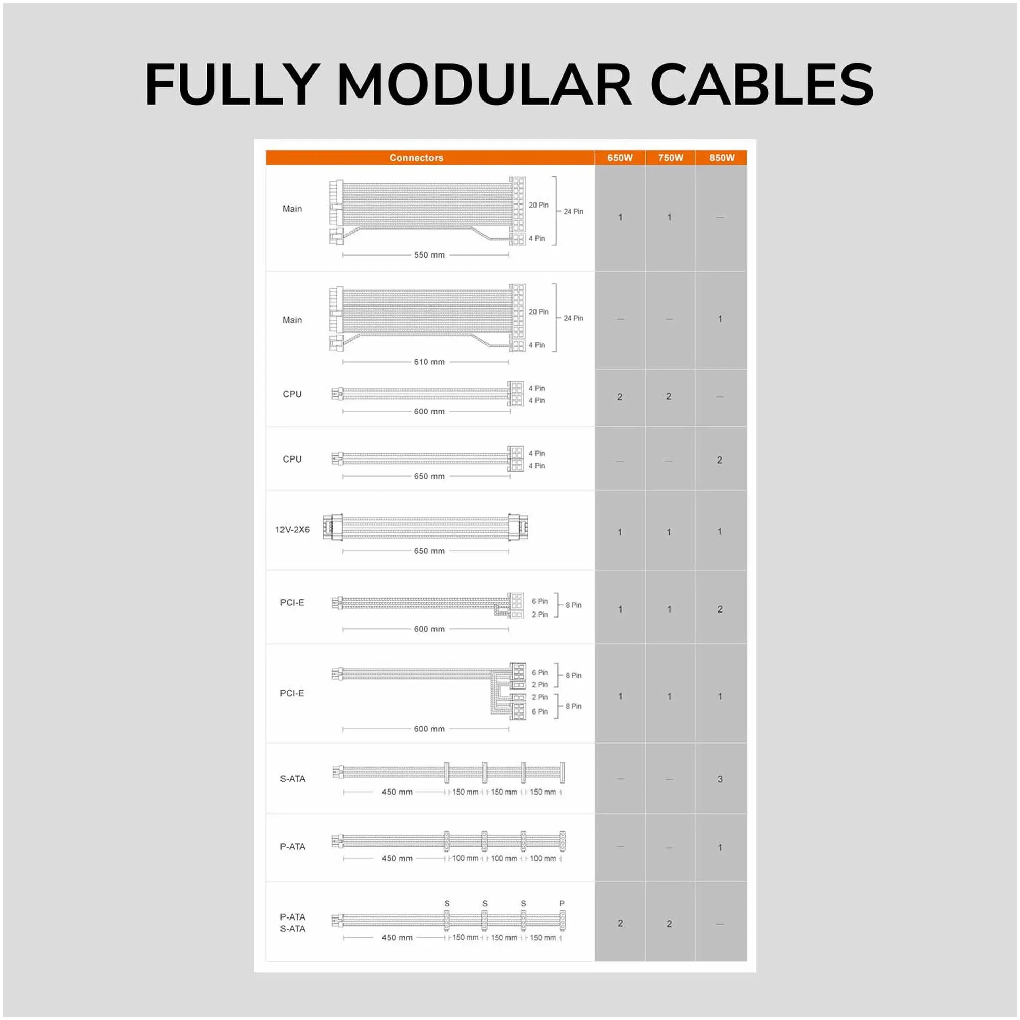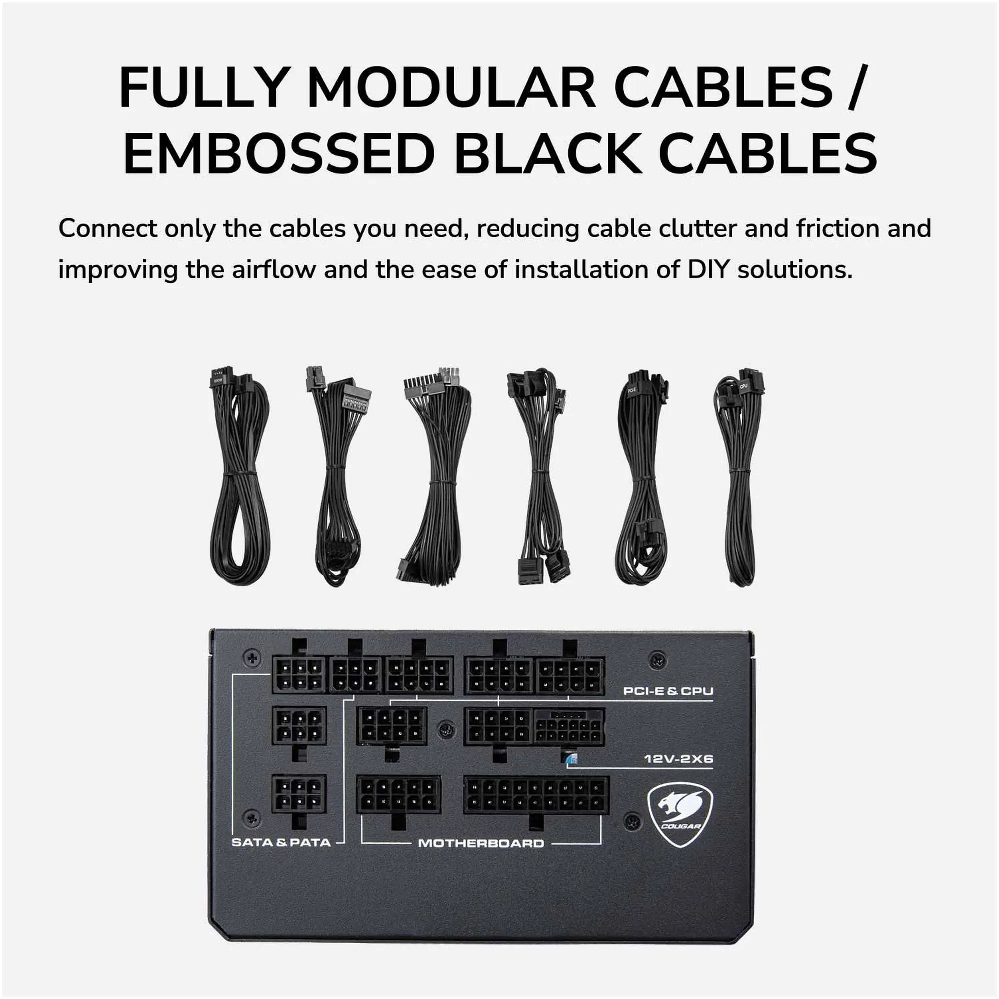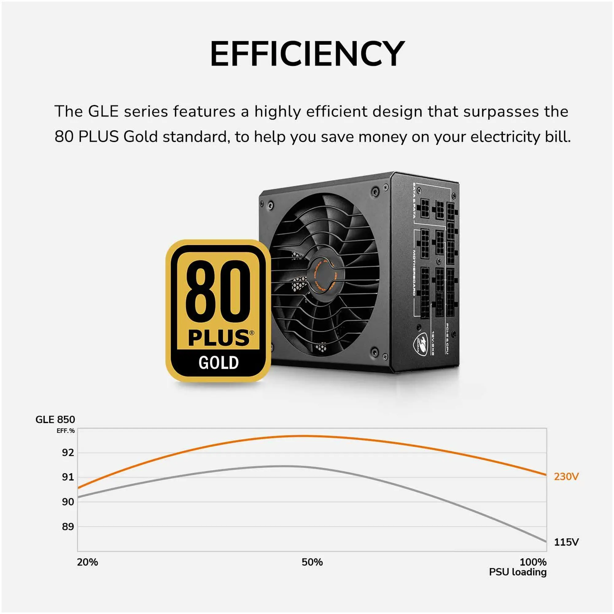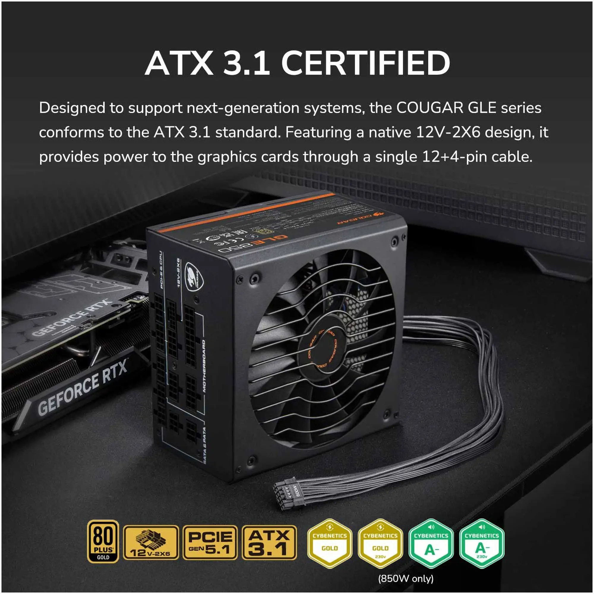 Cougar GLE850 способен выдавать мощность 850 Вт по линии +12 В с током до 70,8 А, что достаточно для самых требовательных компонентов. Он оснащён большим набором коннекторов: 24-контактным основным кабелем, двумя CPU (4+4), четырьмя Molex, двенадцатью SATA, четырьмя PCI-E (6+2) и разъёмом 12+4 для новейших видеокарт. Элегантный корпус чёрного цвета с фирменным дизайном гармонично впишется в любую игровую или рабочую станцию, подчеркивая её мощь и современность.