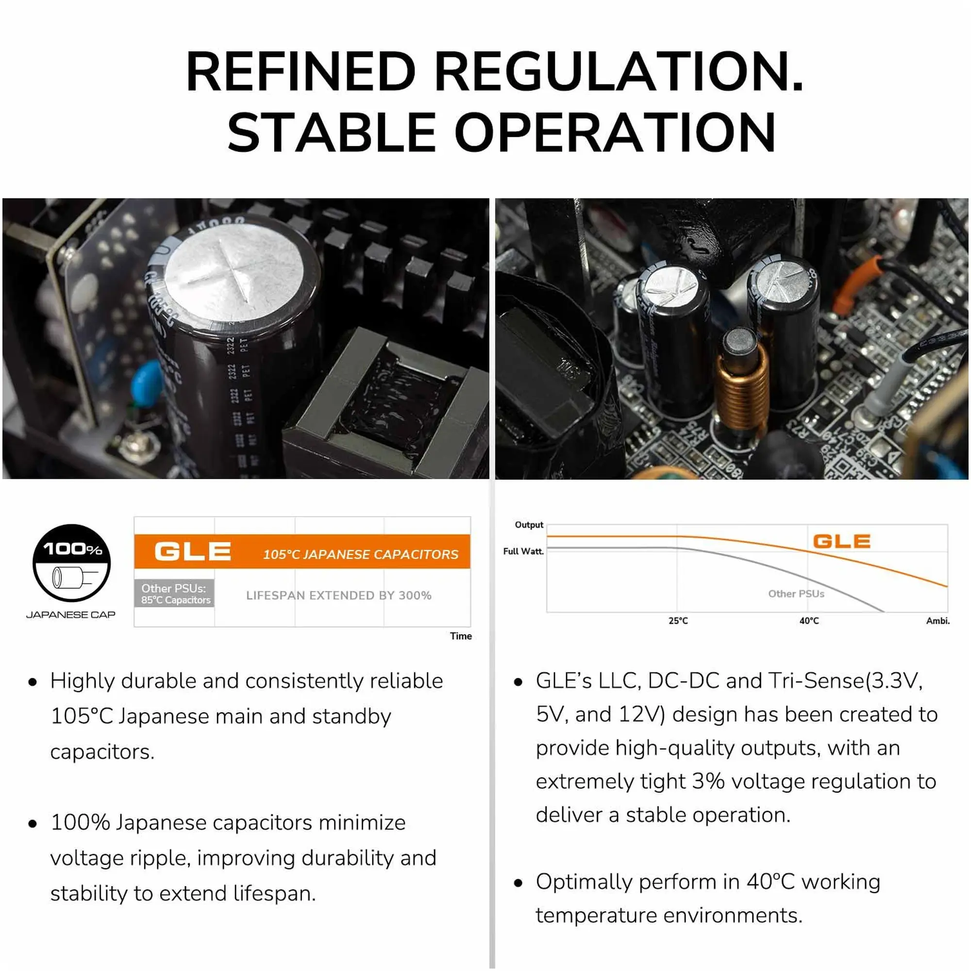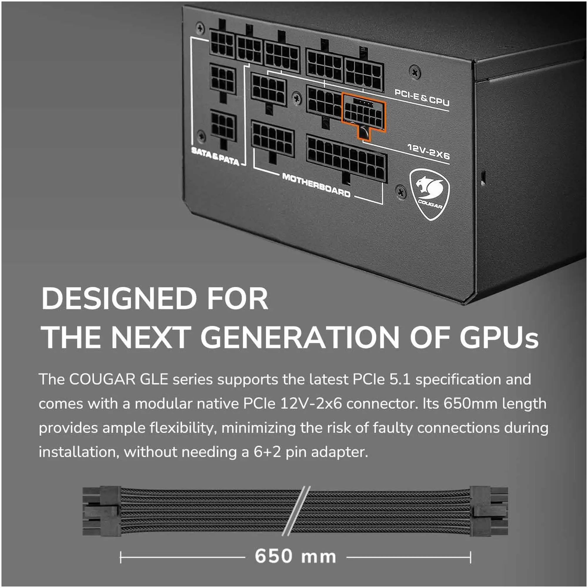 Блок питания Cougar GLE850 — это современное решение для тех, кто ценит стабильность и высокую производительность системы. Сертификация 80 PLUS Gold гарантирует высокий уровень энергоэффективности, позволяя экономить электроэнергию и снижать нагрев компонентов. Cougar GLE850 соответствует стандарту ATX 3.1 и оснащён универсальным разъёмом 12V-2X6, который обеспечивает надёжное питание графических карт нового поколения без необходимости в дополнительных переходниках. Использование японских конденсаторов с температурной стойкостью до 105 °C делает этот блок питания особенно долговечным и надёжным в условиях максимальных нагрузок.