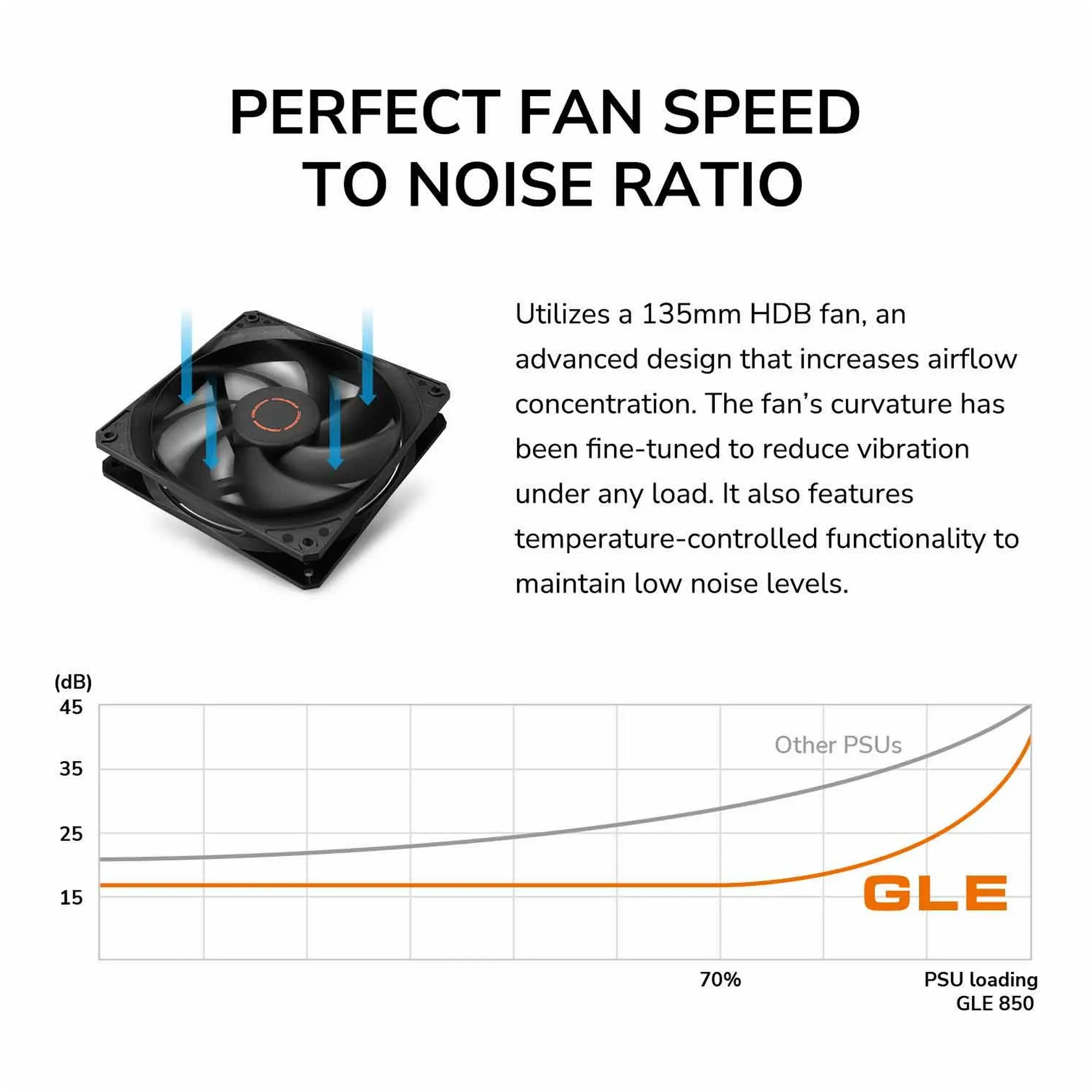 Вентиляция реализована через 135-миллиметровый вентилятор на гидродинамических подшипниках (HDB), отличающийся тихой и плавной работой. Умная система регулировки оборотов позволяет снизить уровень шума и при этом сохранить оптимальное охлаждение, что особенно важно для геймеров и создателей контента. Благодаря полностью модульной системе кабелей можно подключить только необходимые линии, обеспечив аккуратность внутри корпуса и лучший воздушный поток.