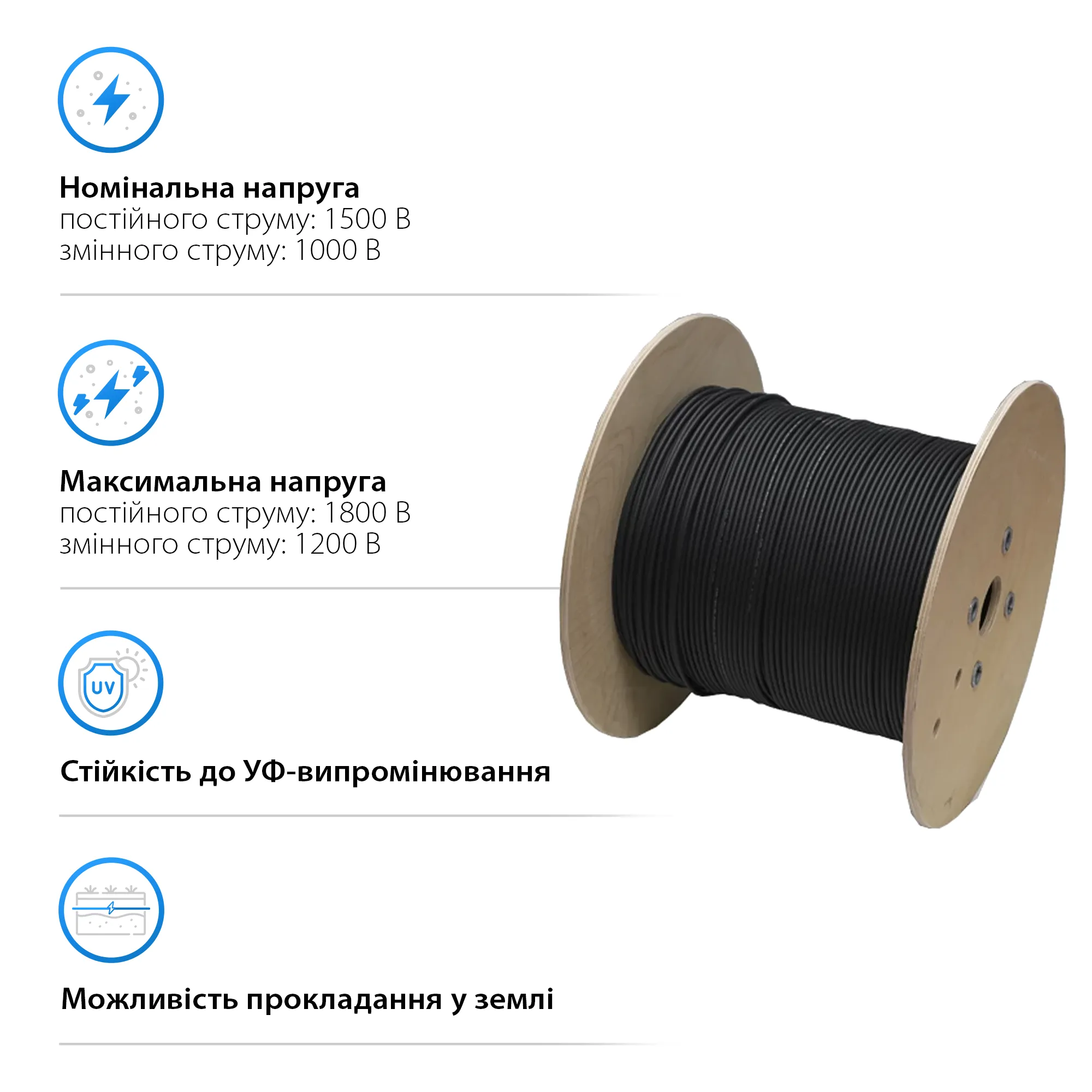 Срок службы этого кабеля составляет 25 лет, что делает его одним из самых долговечных на рынке. Цена продукта оправдана его высочайшим качеством и надежностью. Приобретая его в Киеве или с доставкой по всей Украине, вы делаете выбор в пользу безопасности и эффективности вашей солнечной электростанции на долгие годы вперед.