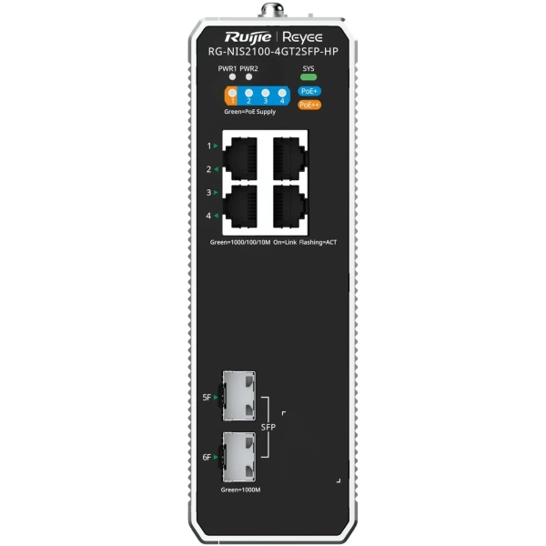 Ruijie Reyee RG-NIS2100-4GT2SFP-HP оснащен 6 портами Gigabit Ethernet (10/100/1000 Мбит/с), включая 4 порта с поддержкой стандартов PoE 802.3af/802.3at/802.3bt. Это дает возможность одновременно передавать данные и питание для совместимых устройств, упрощая развертывание IP-камер, точек доступа и другого сетевого оборудования.