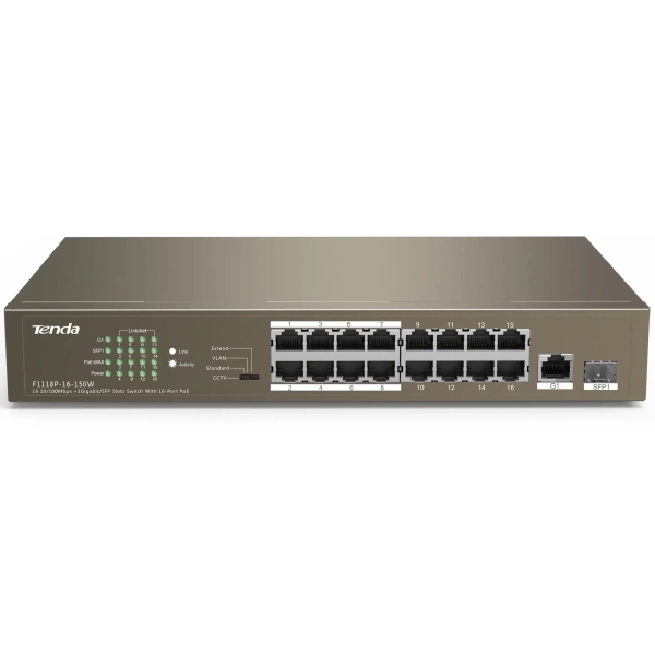 Tenda TEF1118P-16-150W – практичный PoE-коммутатор, который помогает организовать подключение и питание сетевых устройств в одной точке. Он особенно полезен в офисах и системах видеонаблюдения, где нужно быстро развернуть инфраструктуру для камер, точек доступа или IP-телефонов, сохранив чистоплотность и предполагаемую работу сети.