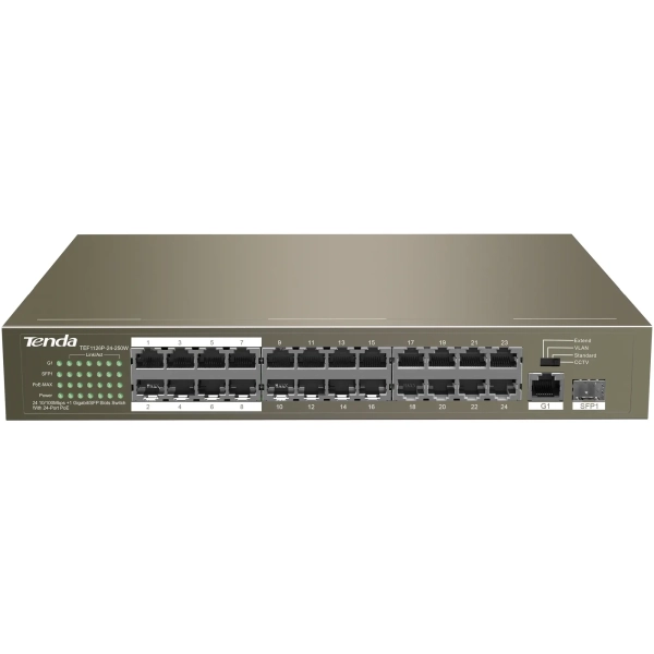 Tenda TEF1126P-24-250W — неуправляемый PoE-коммутатор, рассчитанный на удобное подключение и питание сетевых устройств в офисе или системе видеонаблюдения. Он помогает быстро развернуть инфраструктуру, где требуется не только передача данных, но и подача питания по Ethernet-кабелю — без дополнительных адаптеров и розеток рядом с оборудованием.