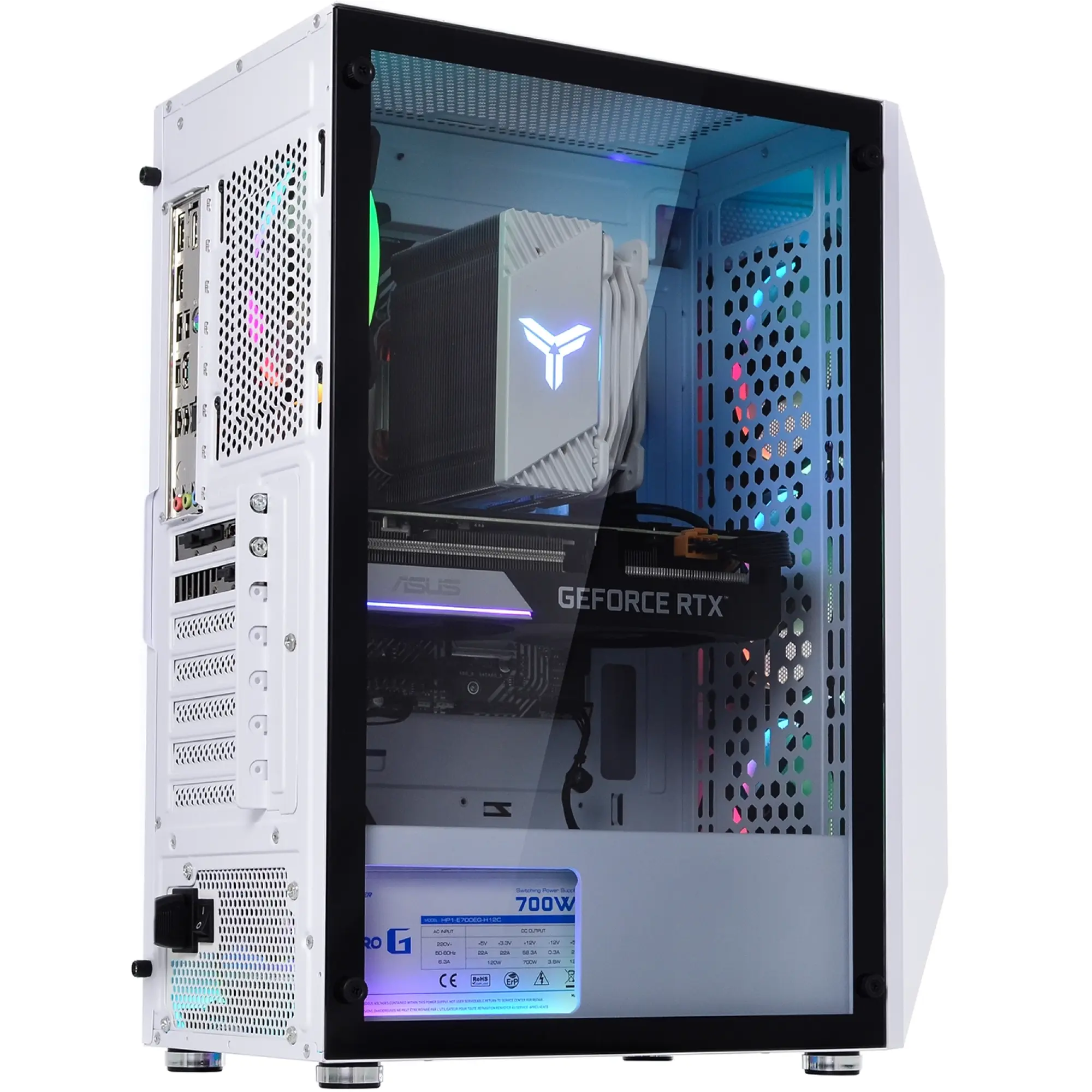 Корпус компьютера выполнен в элегантном белом цвете, что придает устройству стильный и современный вид. Особенностью дизайна являются вентиляторы с адресной RGB-подсветкой, которые можно настроить под индивидуальные предпочтения, создавая уникальную атмосферу во время игры. Закаленное стекло толщиной 4 мм на боковой панели позволяет любоваться компонентами системы, а установленные пылевые фильтры на верхней и передней панелях обеспечивают защиту от пыли и сохраняют чистоту внутри корпуса.