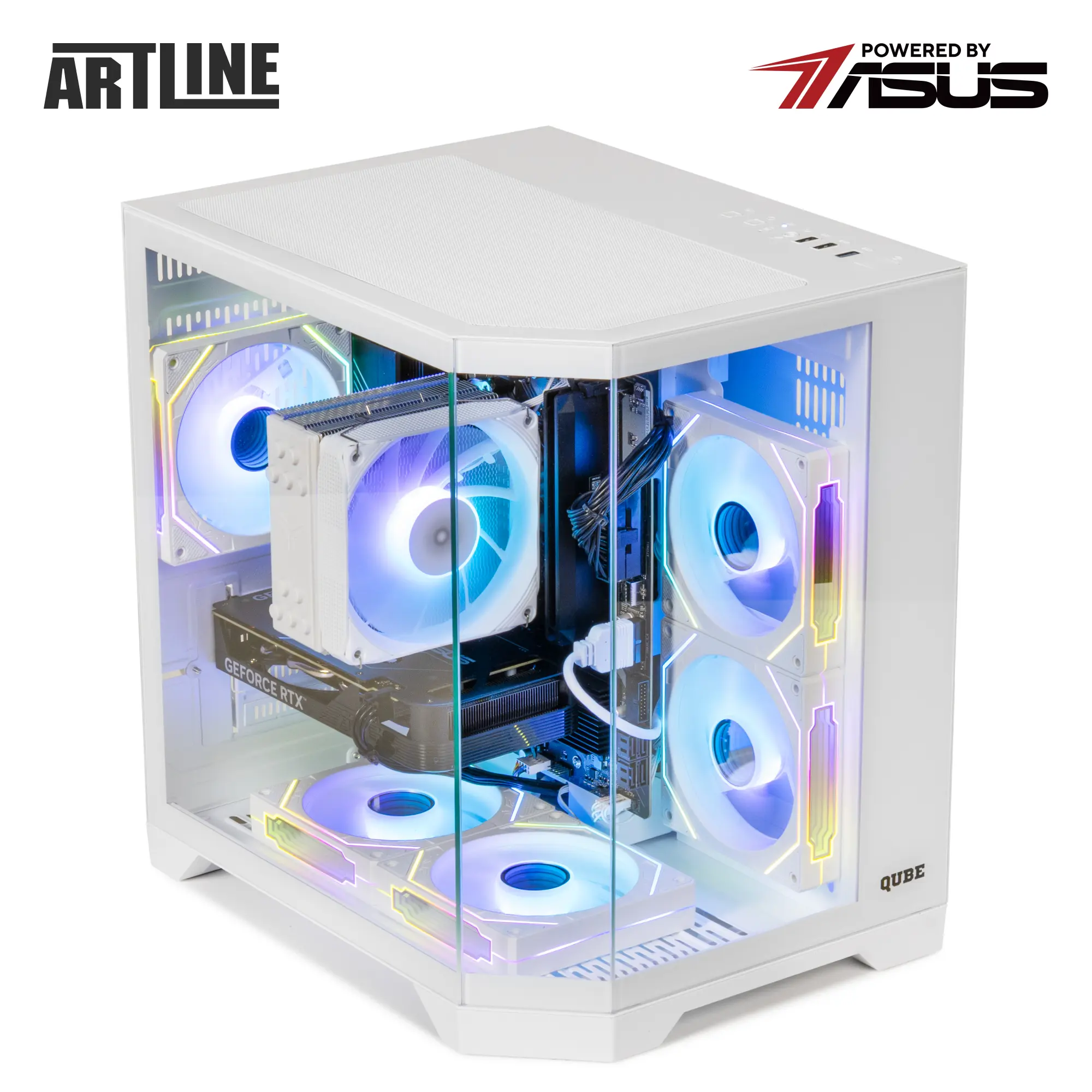 Корпус QUBE CRYSTAL White в форм-факторе Tower сразу привлекает внимание своим белоснежным дизайном и закалённым стеклом толщиной 4 мм на передней и боковой панелях. Стильная RGB-подсветка, которую создают 5 вентиляторов по 120 мм, добавляет визуального шарма и подчеркивает игровой дух устройства.