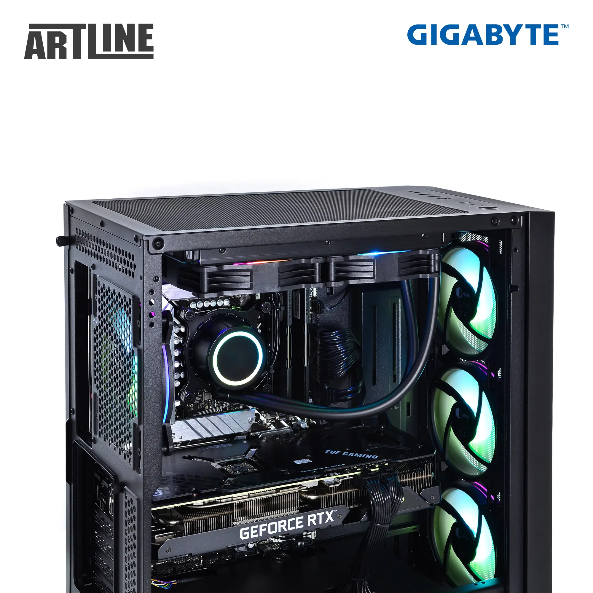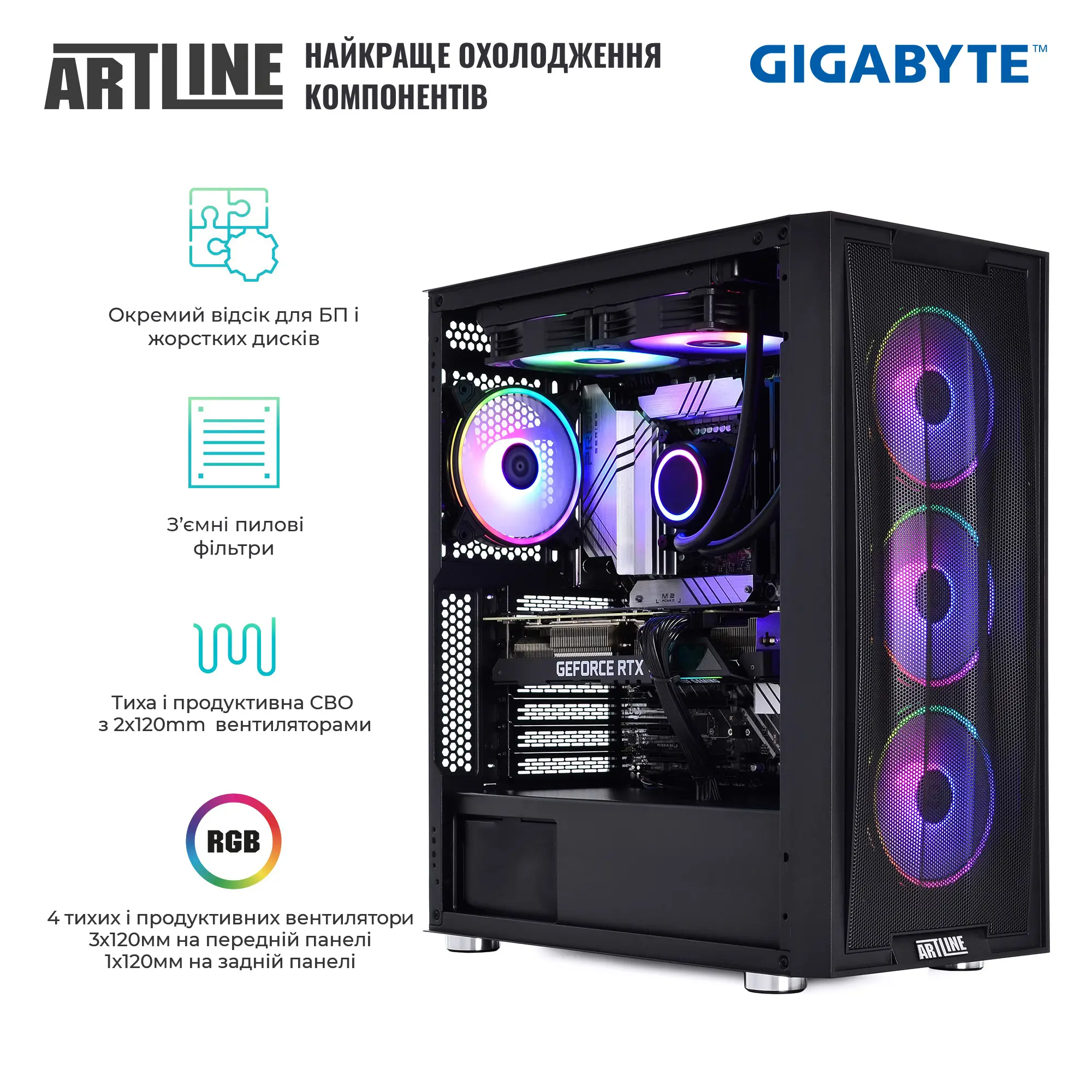- 3x120mm ARGB LED fans (Front) + 1x120mm ARGB LED fan (Rear) + 2x120mm RGB LED fans (Top for cooling system)