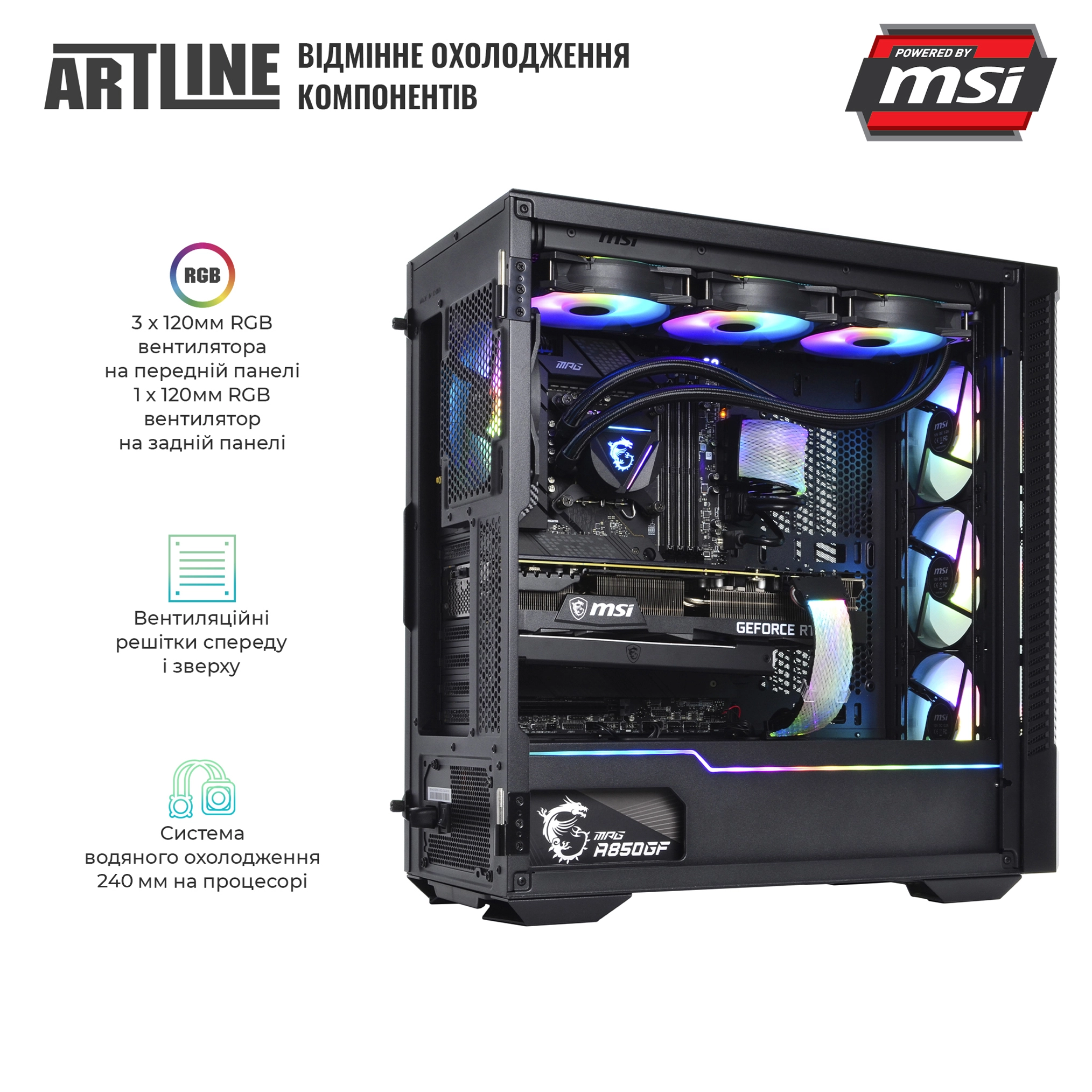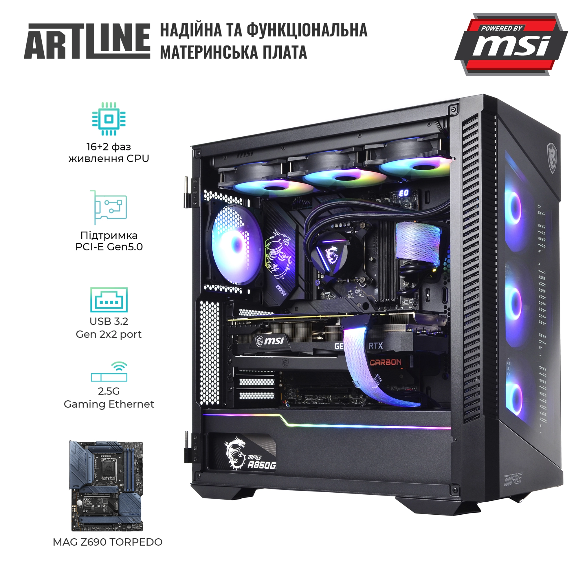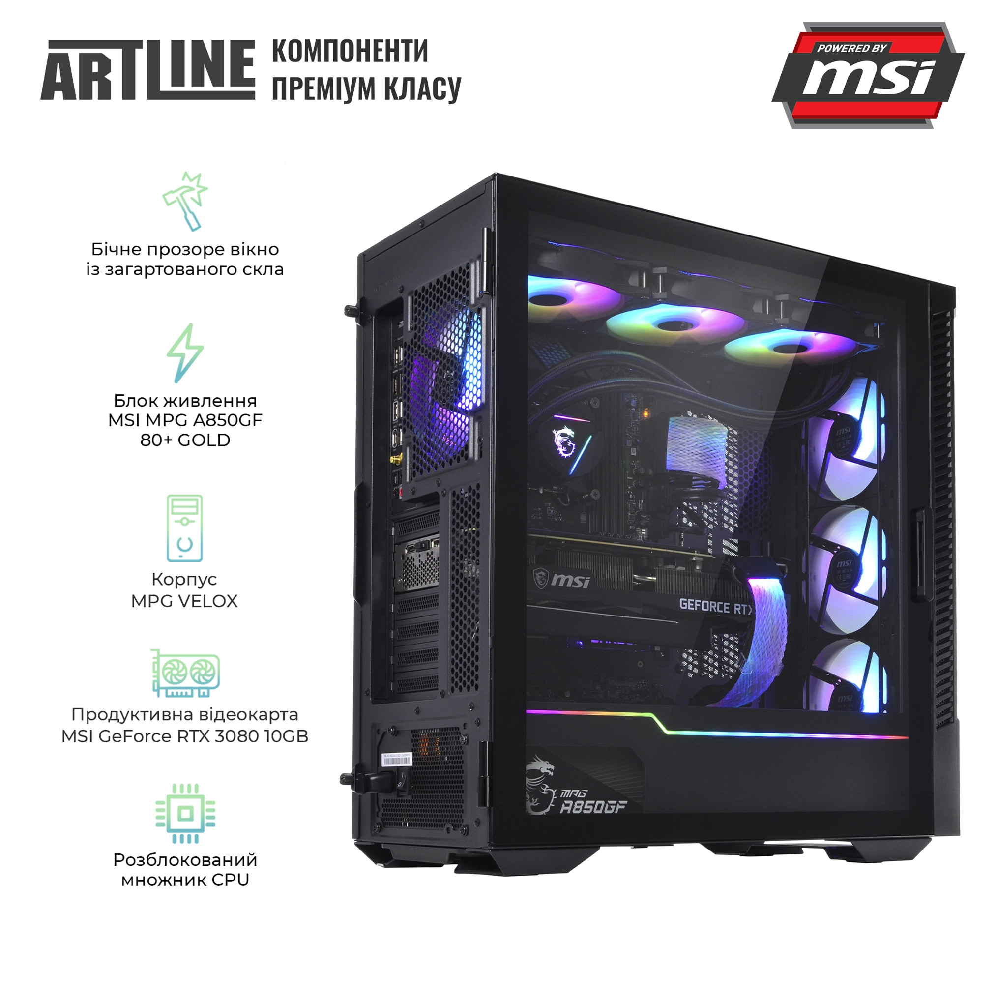 Все комплектующие ARTLINE DRAGONv94 размещены в игровом корпусе MPG VELOX 100R с блоком питания MPG A850GF на 850 Вт и комплектом RGB LED вентиляторов. Корпус впечатляет с первого взгляда своим великолепным внешним видом. Прозрачная боковая панель позволяет любоваться подсветкой внутренних компонентов собранной системы.