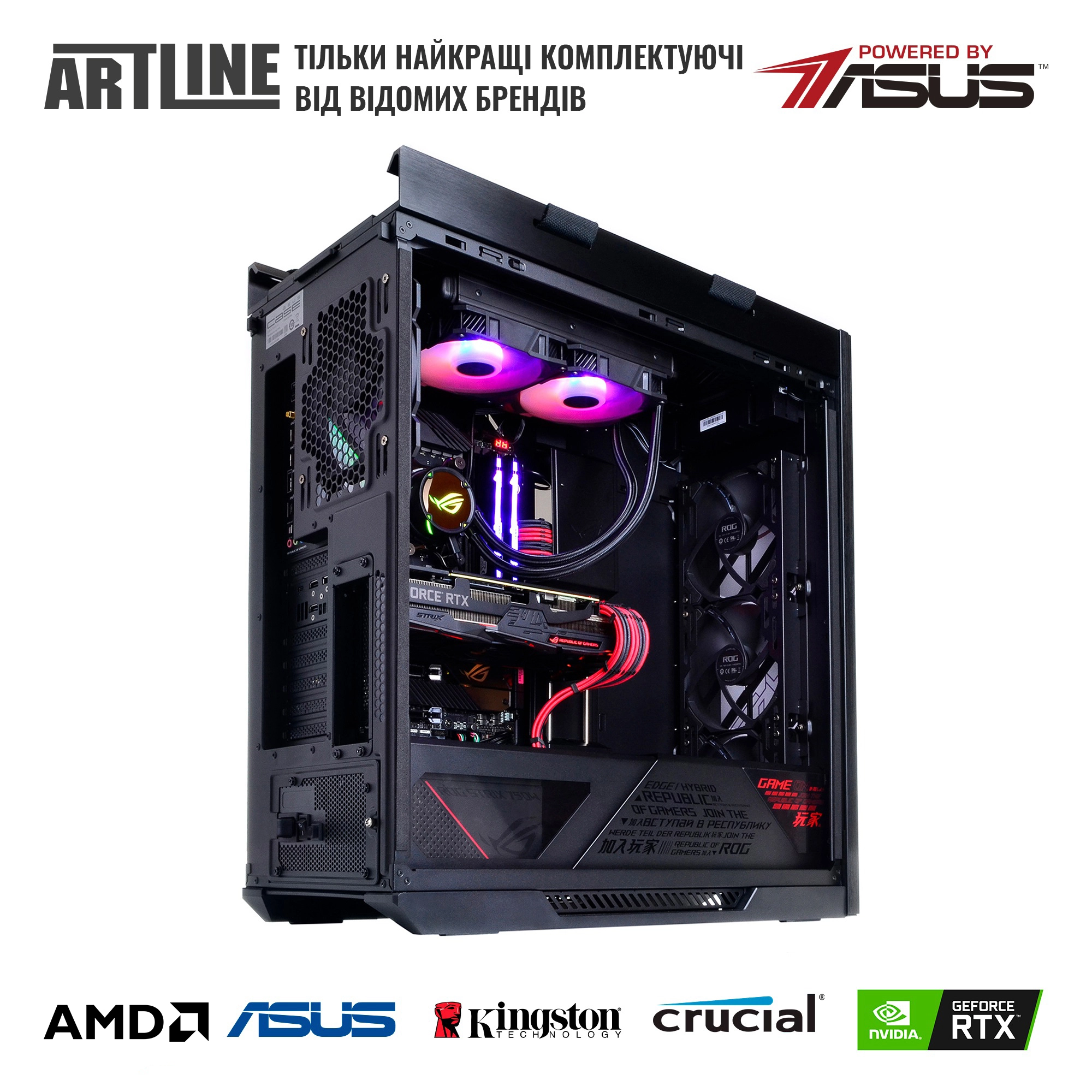 Все комплектующие ARTLINE Gaming STRIXv90Win размещены в корпусе ASUS ROG STRIX HELIOS с блоком питания STRIX на 1000 Вт сертификации 80+ Gold и комплектом вентиляторов для эффективного охлаждения.