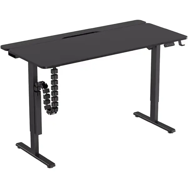 Прямоугольная столешница выполнена из ДСП толщиной 18 мм, что обеспечивает удачный баланс между практичностью и современным внешним видом. Поверхность стола хорошо подходит для размещения компьютерной техники, аксессуаров и рабочих принадлежностей, сохраняя аккуратность и удобство в повседневном использовании. Черный цвет столешницы подчеркивает универсальность модели и придает ей солидный, технологичный характер.