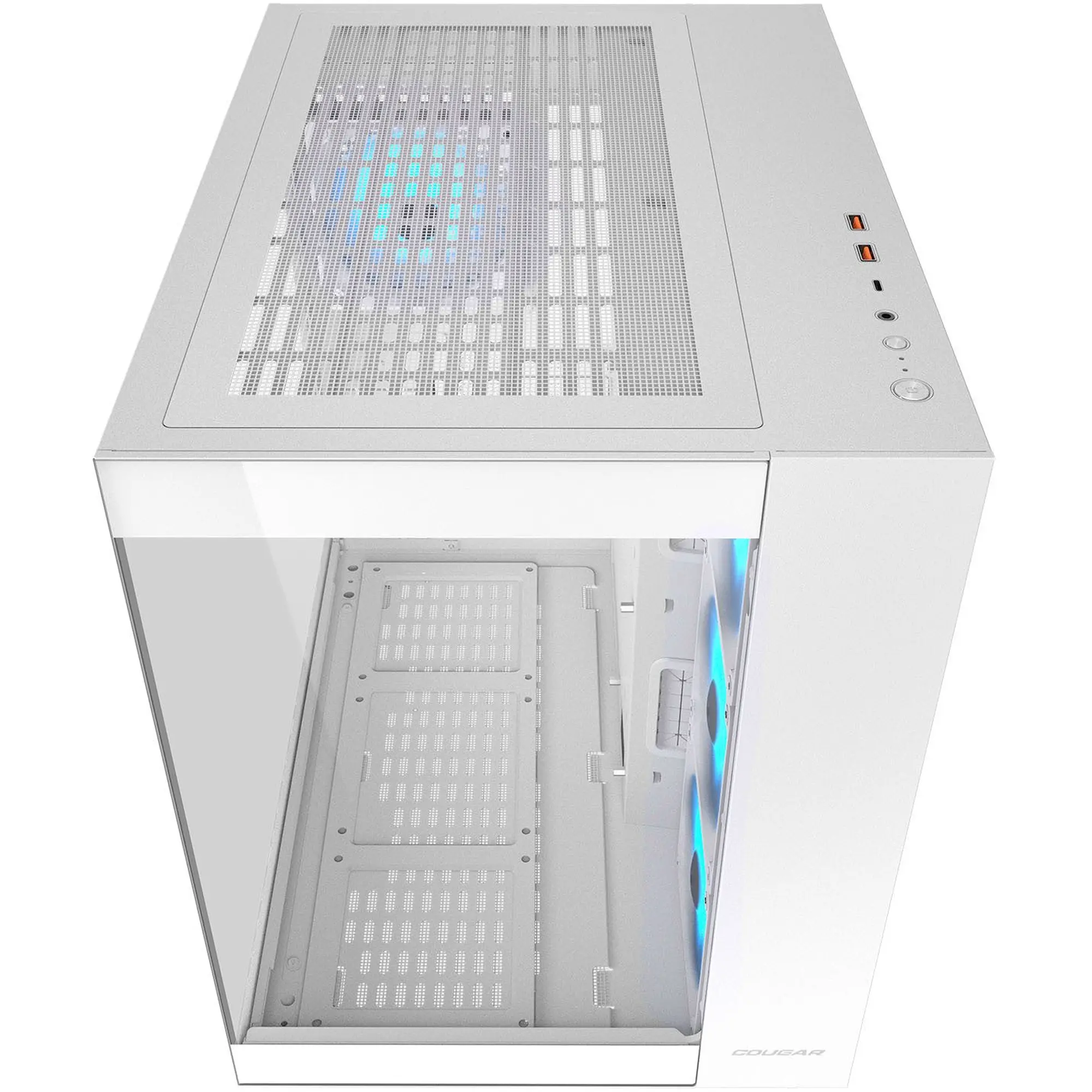 Корпус оснащён пылевыми фильтрами спереди, сверху и сбоку, которые легко снимаются для обслуживания. Подсветка синхронизируется с системой благодаря встроенному хабу вентиляторов, создавая единый световой эффект внутри корпуса. Cougar FV150 RGB White сочетает стиль, функциональность и практичность, предлагая отличную основу для современных игровых и универсальных конфигураций.