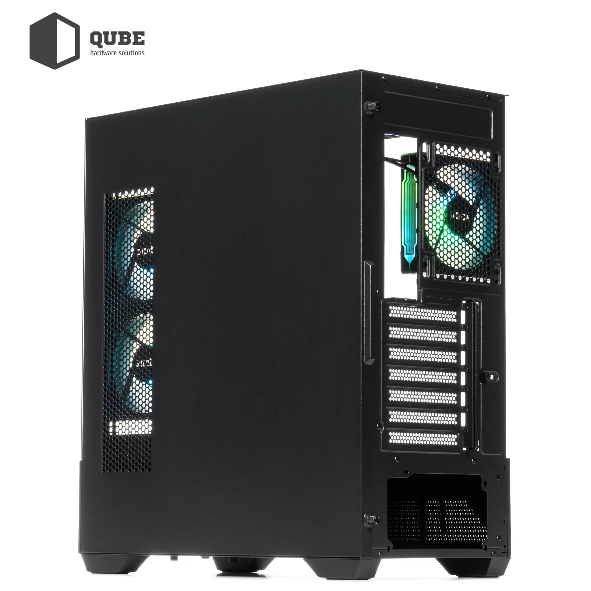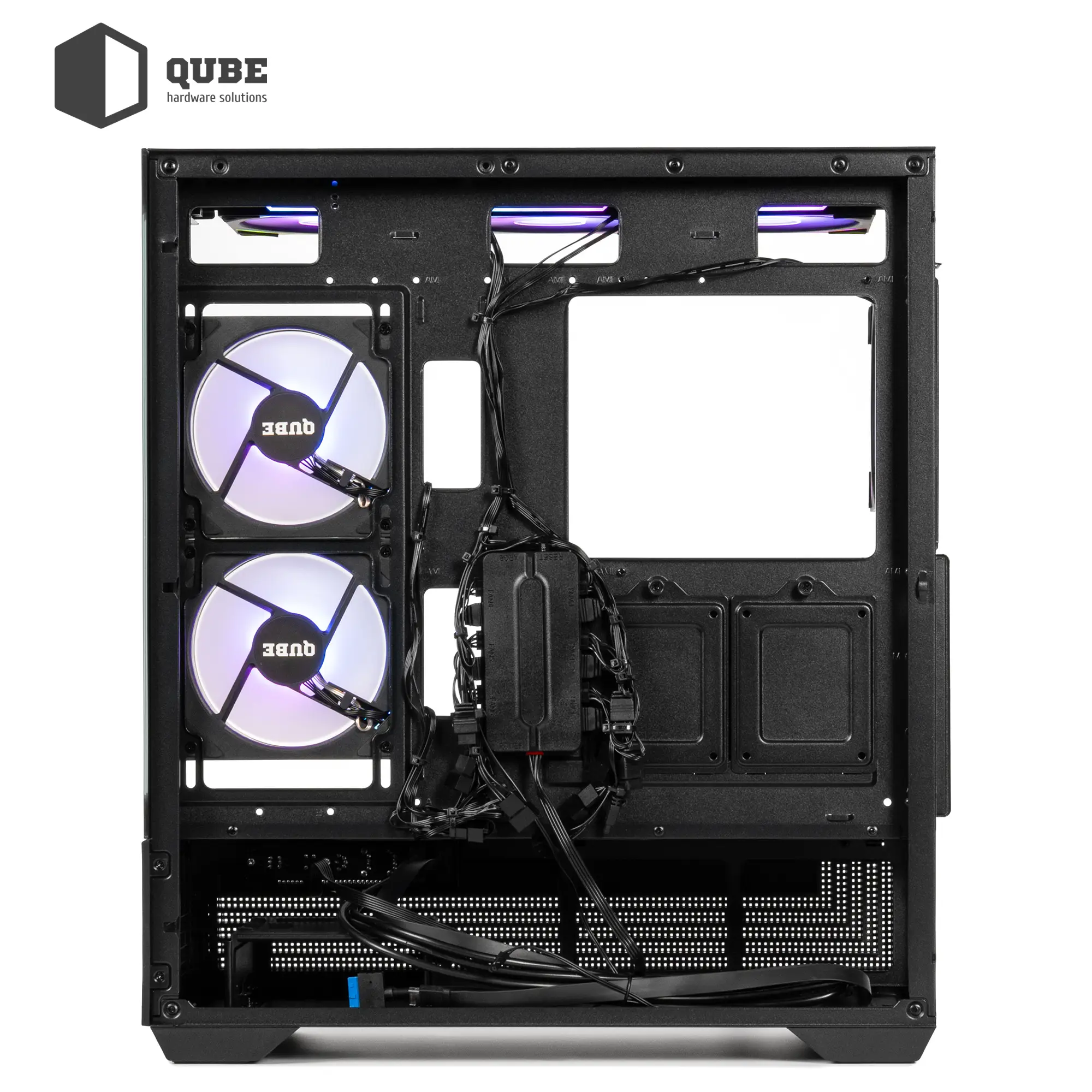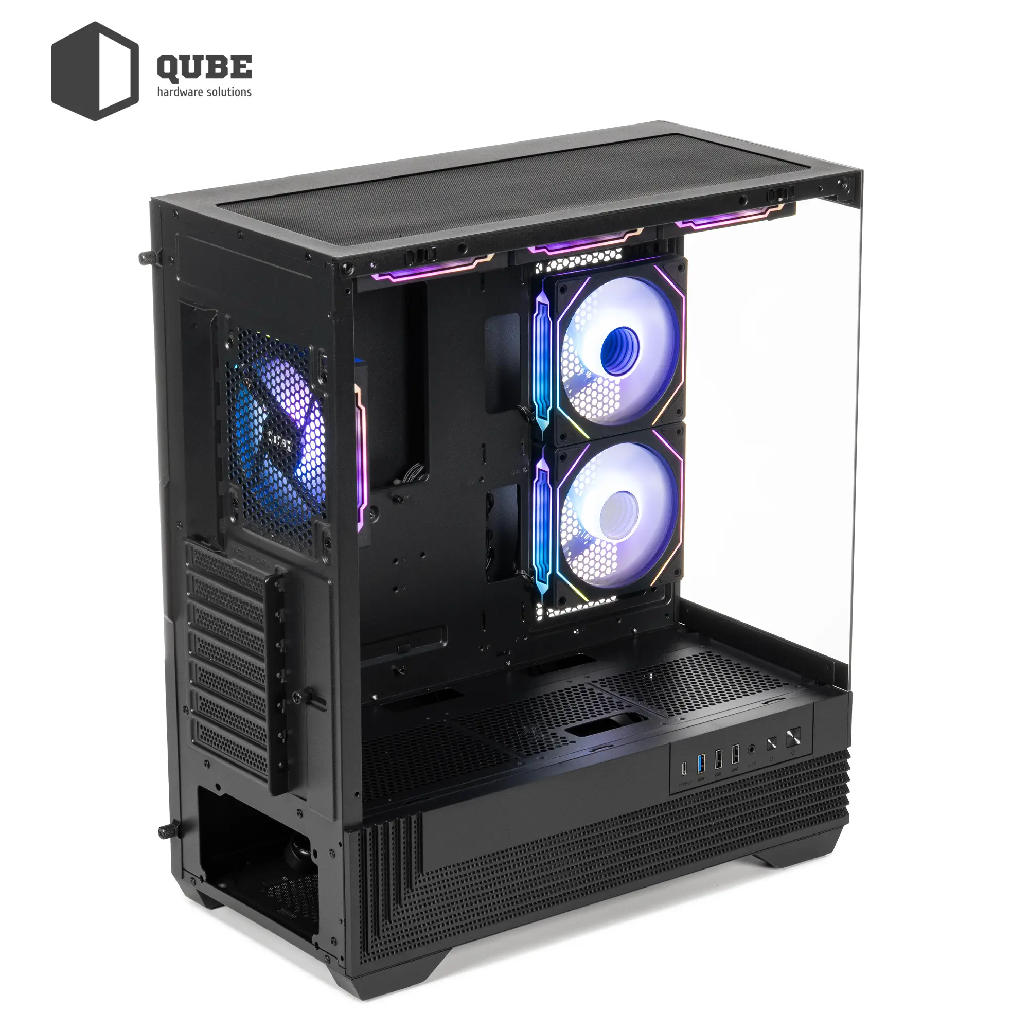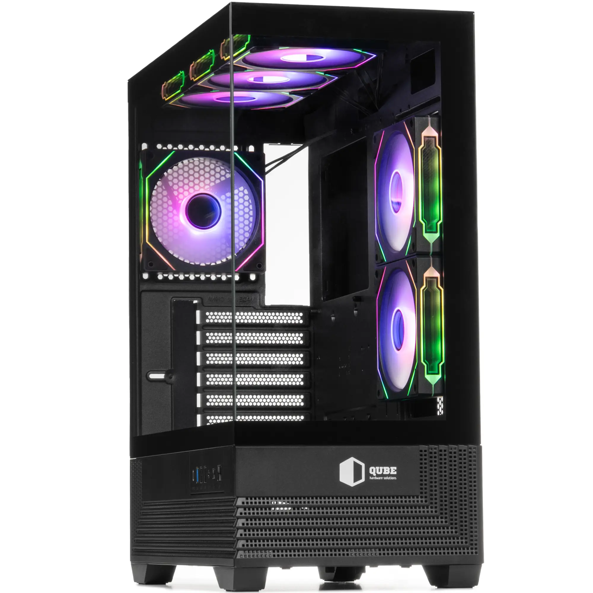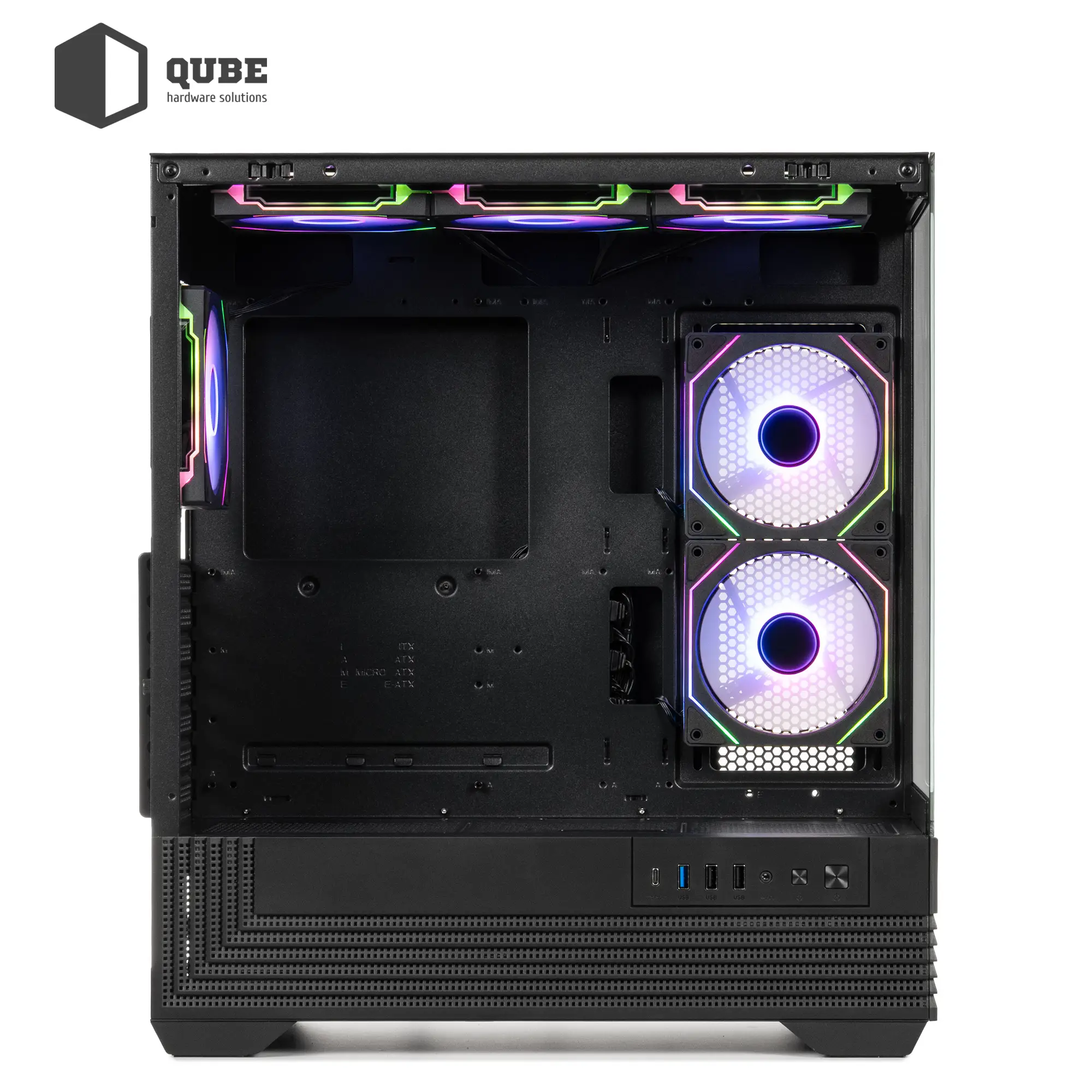 Корпус QUBE FORT ARGB Black (FORT_GBNU3) – это современное и вместительное решение для сборки производительного игрового или рабочего компьютера. Его строгий дизайн с панелью из закалённого стекла подчёркивает эстетику комплектующих и позволяет создать эффектную систему с продуманной подсветкой. В комплект входят шесть 120-мм ARGB/PWM вентиляторов с эффектом «бесконечного зеркала», которые не только обеспечивают мощное охлаждение, но и придают корпусу уникальный визуальный стиль. Контроллер и пульт дистанционного управления позволяют гибко регулировать цвета и эффекты подсветки.