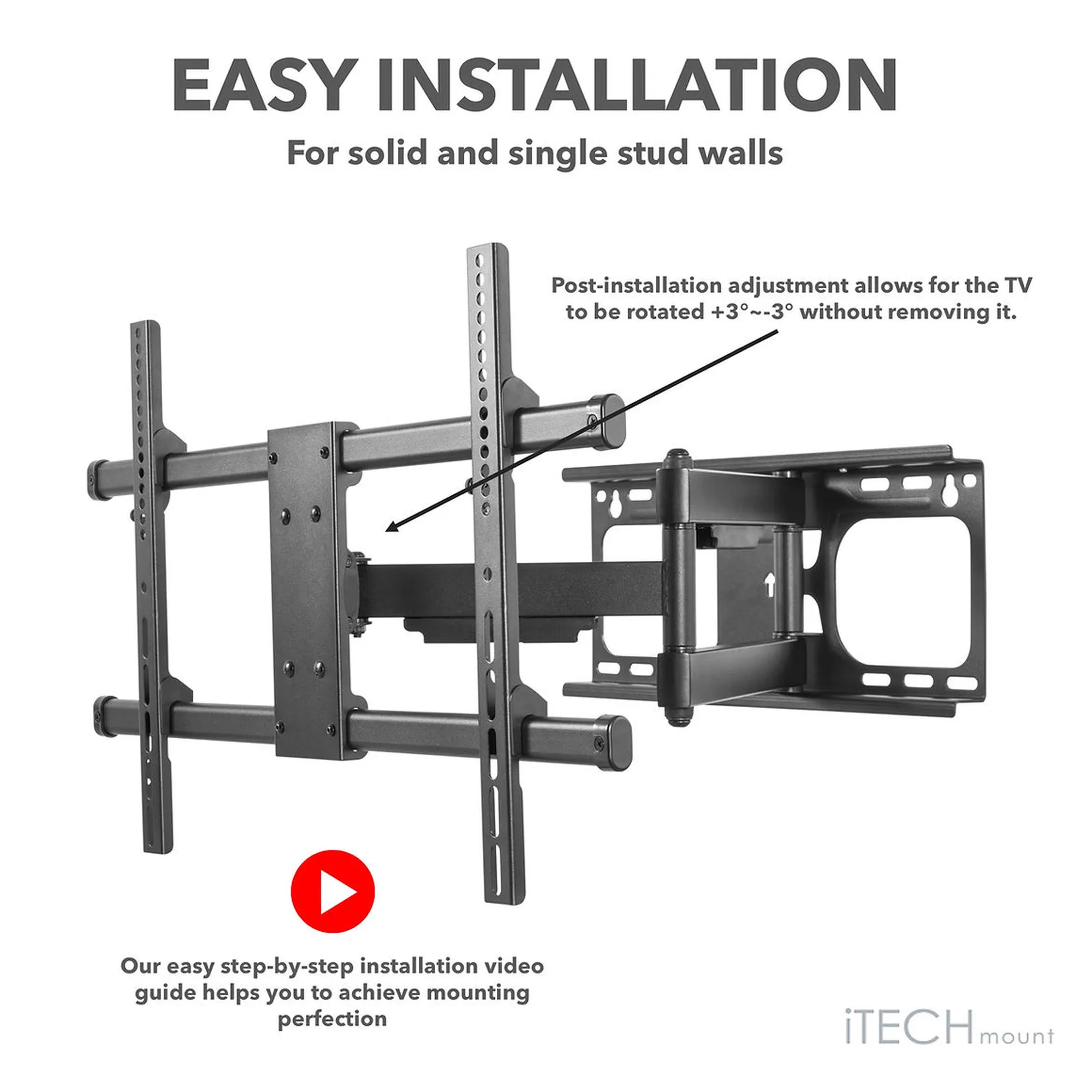 iTECH PTRB-77 — это универсальное настенное крепление, созданное для телевизоров с диагональю от 37 до 70 дюймов. Оно выполнено из прочной стали, способной выдерживать нагрузку до 60 кг, что делает его надежным решением для дома и офиса. Благодаря двойному шарниру кронштейн обеспечивает гибкость в настройке положения экрана, позволяя выдвигать его от стены до 61,5 см, наклонять от +5° до -15° и поворачивать на 90°. Это особенно удобно для больших помещений или ситуаций, когда требуется изменить угол обзора в зависимости от расположения зрителей.