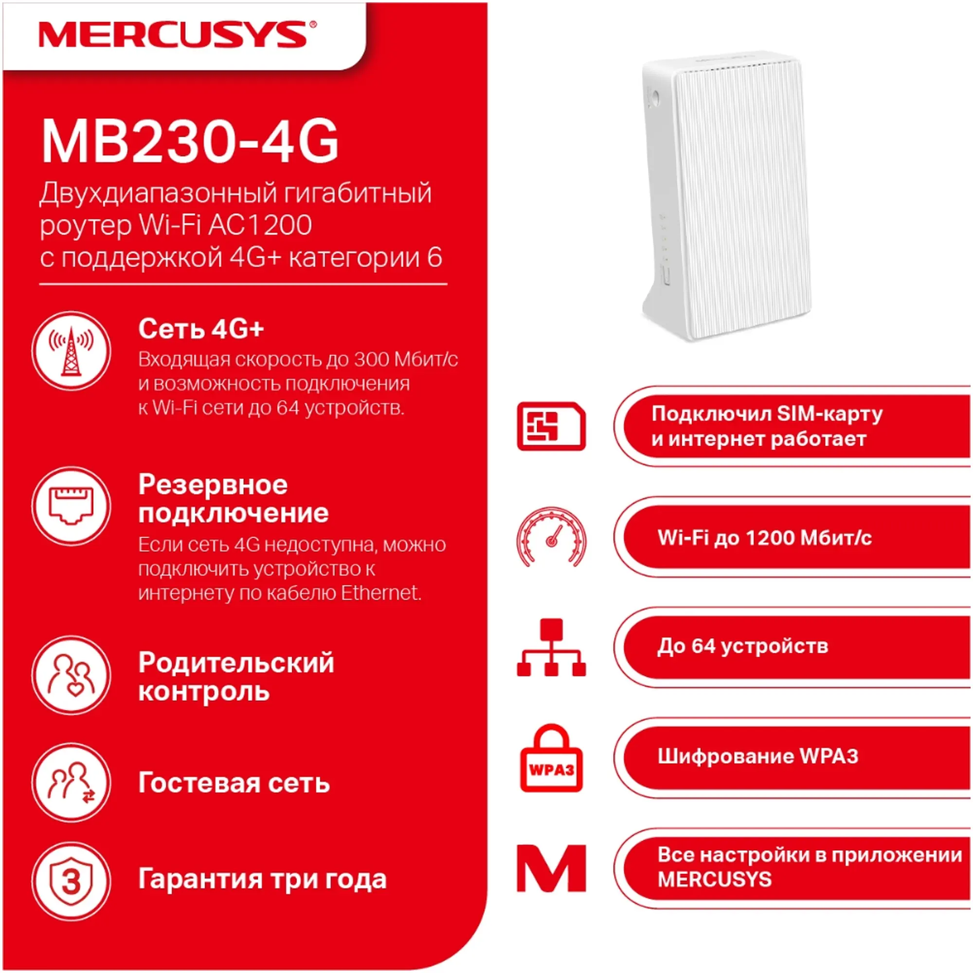 Маршрутизатор Mercusys MB230-4G — это современное устройство с поддержкой стандарта 4G+ категории 6, которое обеспечивает скорость загрузки данных до 300 Мбит/с и отдачи до 50 Мбит/с. Он предлагает дводіапазонный Wi-Fi с суммарной пропускной способностью до 1200 Мбит/с: до 300 Мбит/с в диапазоне 2,4 ГГц и до 867 Мбит/с в диапазоне 5 ГГц. Эта модель способна обслуживать до 64 подключённых устройств одновременно, что делает её подходящей как для дома, так и для небольшого офиса. Маршрутизатор оснащён внешними портами для антенн 4G, поддерживает режим резервного подключения через Ethernet и допускает работу в качестве обычного маршрутизатора, используя WAN-порт вместо SIM-карты.