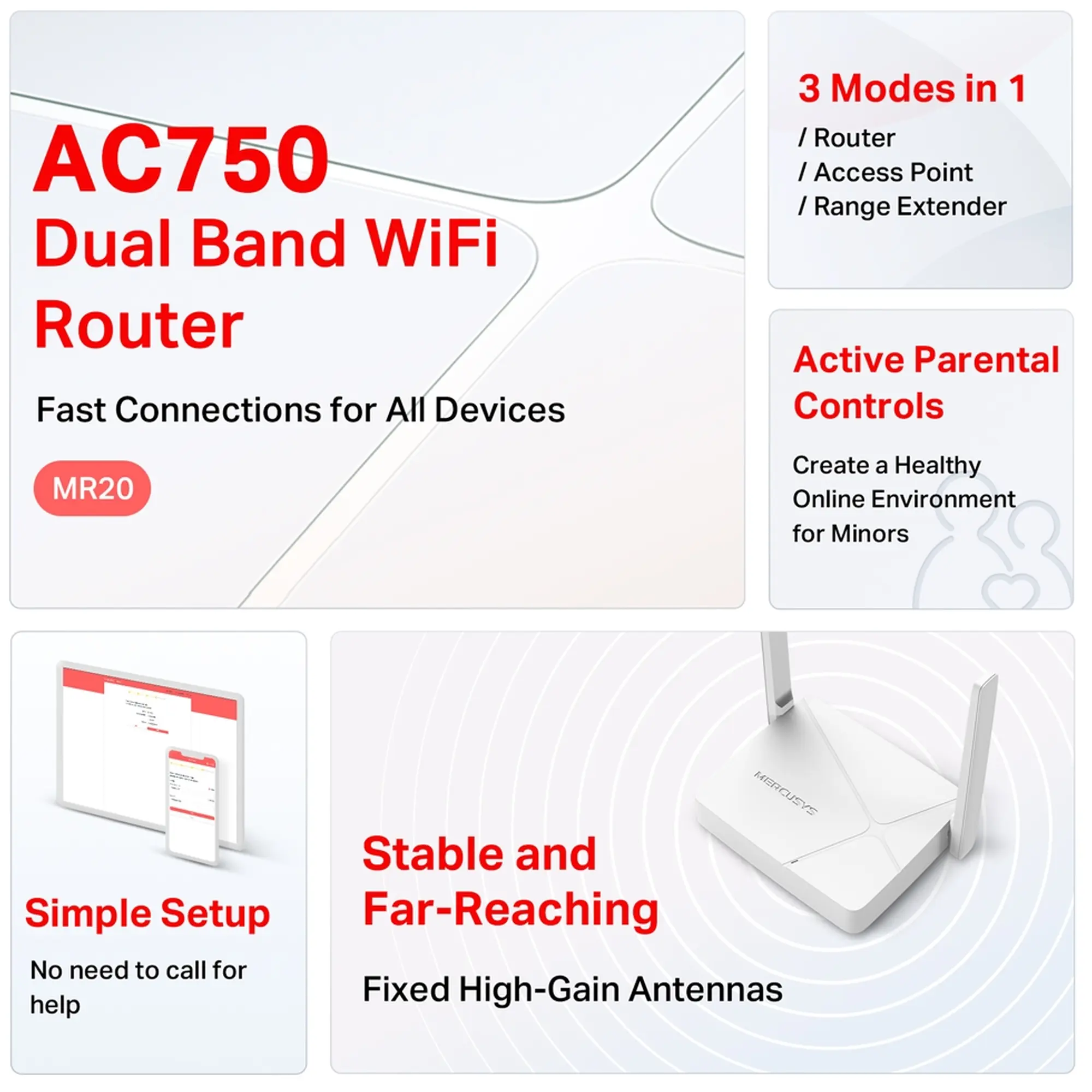 Маршрутизатор Mercusys MR20 представляет собой дводиапазонное устройство стандарта Wi-Fi 5 (802.11ac), обеспечивающее стабильное и быстрое беспроводное соединение для дома или офиса. Он поддерживает скорость передачи данных до 750 Мбит/с, распределяя нагрузку между диапазонами 2,4 ГГц и 5 ГГц, что позволяет одновременно работать с несколькими устройствами без снижения производительности. Это делает маршрутизатор идеальным решением для потокового видео, онлайн-игр и работы с большими файлами.