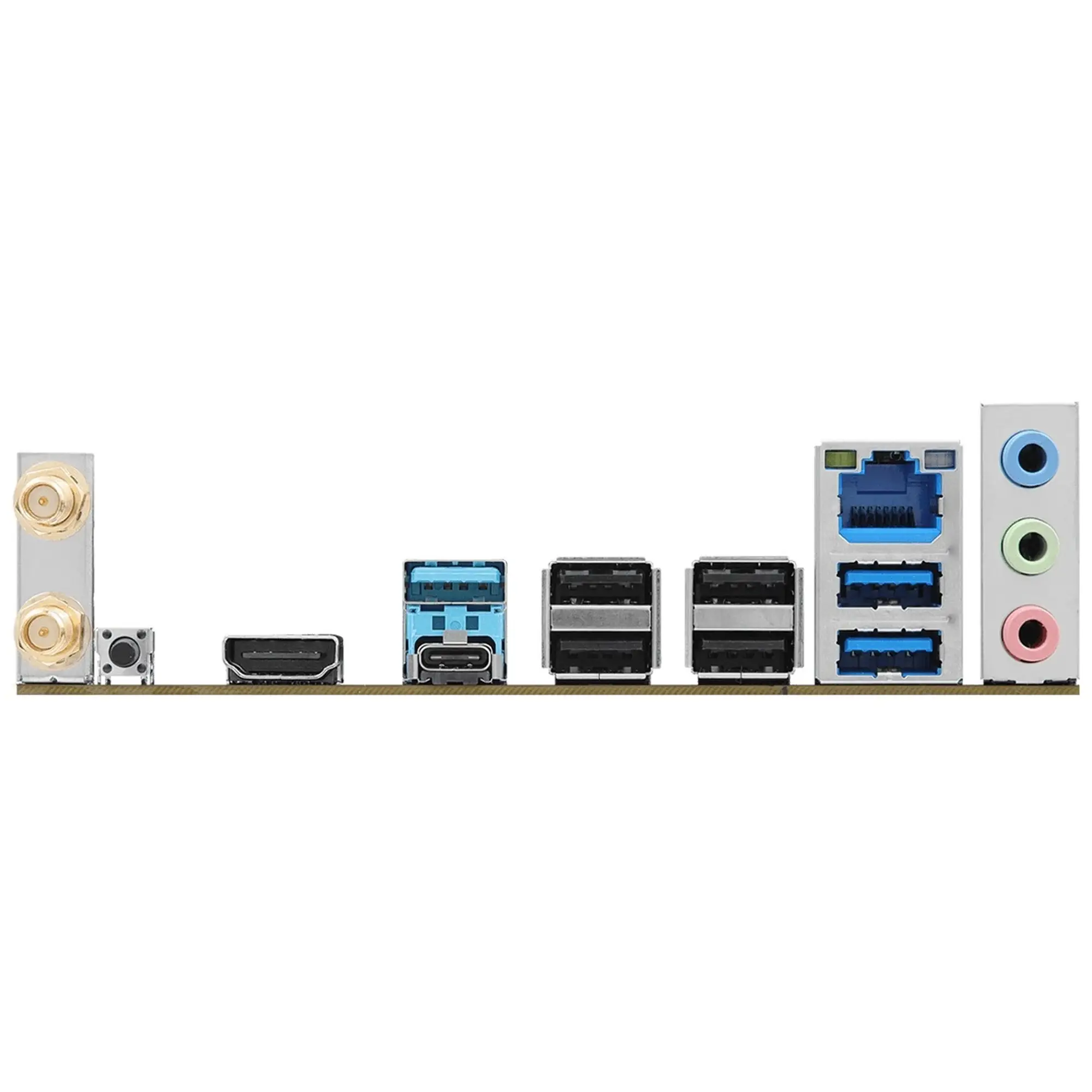 Задняя панель платы предлагает всё необходимое для комфортной работы: USB 2.0, USB 3.2 Gen 1, USB Type-C, кнопка BIOS FlashBack, разъём RJ-45, порты для антенн Wi-Fi, а также встроенное аудио Realtek ALC897 с поддержкой 7.1-канального звука. В комплектацию входят инструкция, оригинальная упаковка и сама материнская плата. Размеры изделия — 244×244 мм.