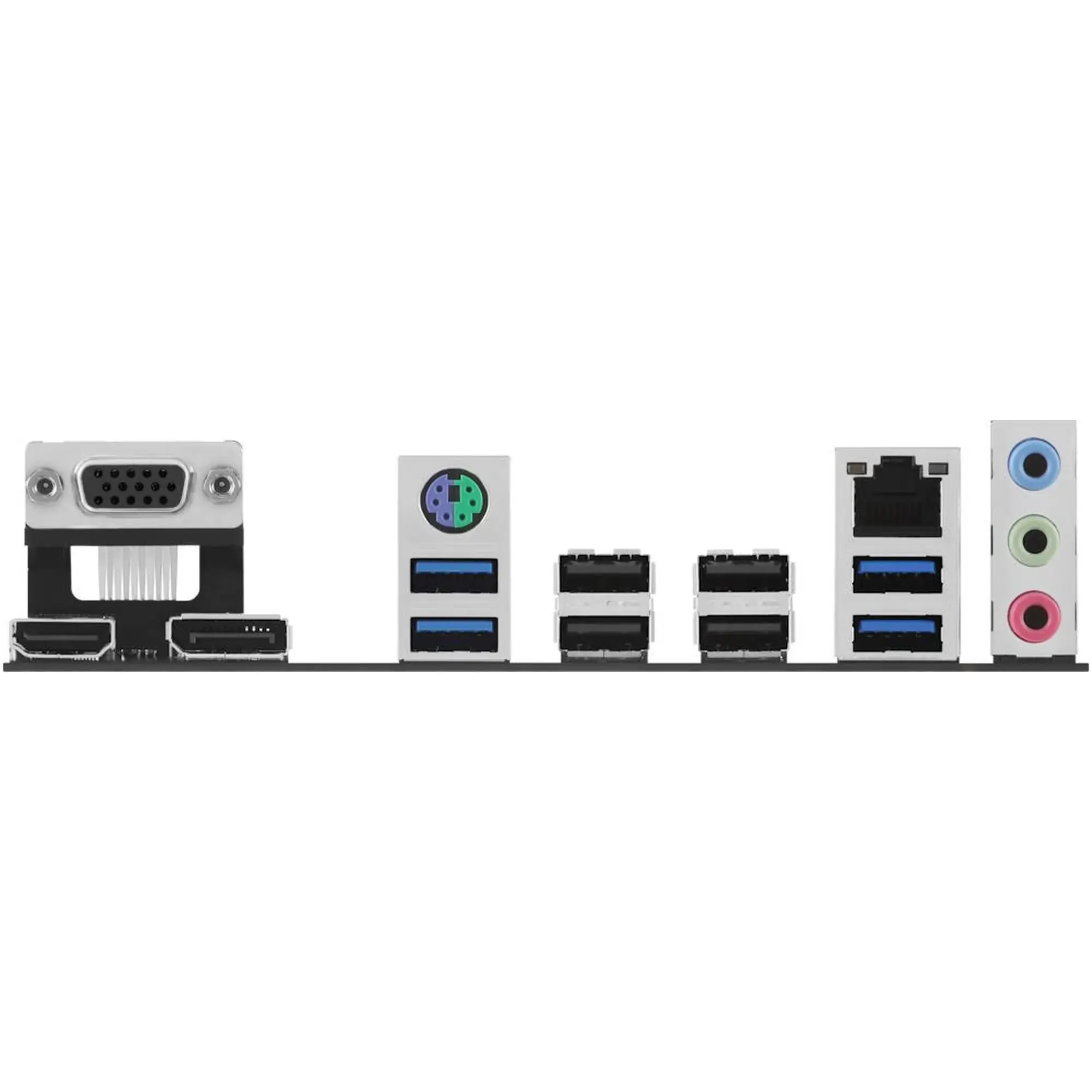 На задней панели располагаются необходимые разъемы для современных рабочих станций: 4 x USB 3.2 Gen1, 4 x USB 2.0, порты HDMI, DisplayPort, VGA, комбинированный PS/2, сетевой интерфейс Realtek 1Gb Ethernet, а также аудиосистема Realtek 7.1-Channel для подключения многоканальных акустических систем. Питание обеспечивается классическими разъемами 24-pin Main Power и 8-pin 12V Power, что делает плату совместимой с большинством БП.