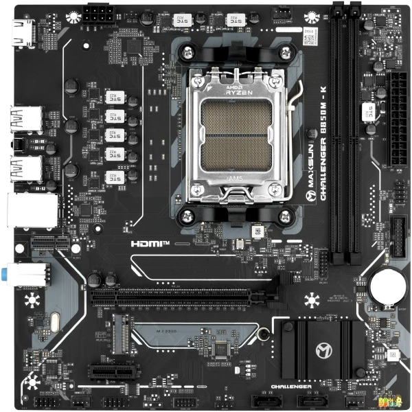 Материнская плата Maxsun MS-Challenger B850M-K создана для стабильной и современной компьютерной платформы, ориентированной на повседневную работу, офисные задачи и домашний мультимедийный контент. Форм-фактор Micro-ATX позволяет собирать производительные системы в компактных корпусах, сохраняя доступ к широким возможностям расширения. Поддержка процессоров на базе разъёма AMD AM5 делает плату актуальным выбором для конфигураций нового поколения.