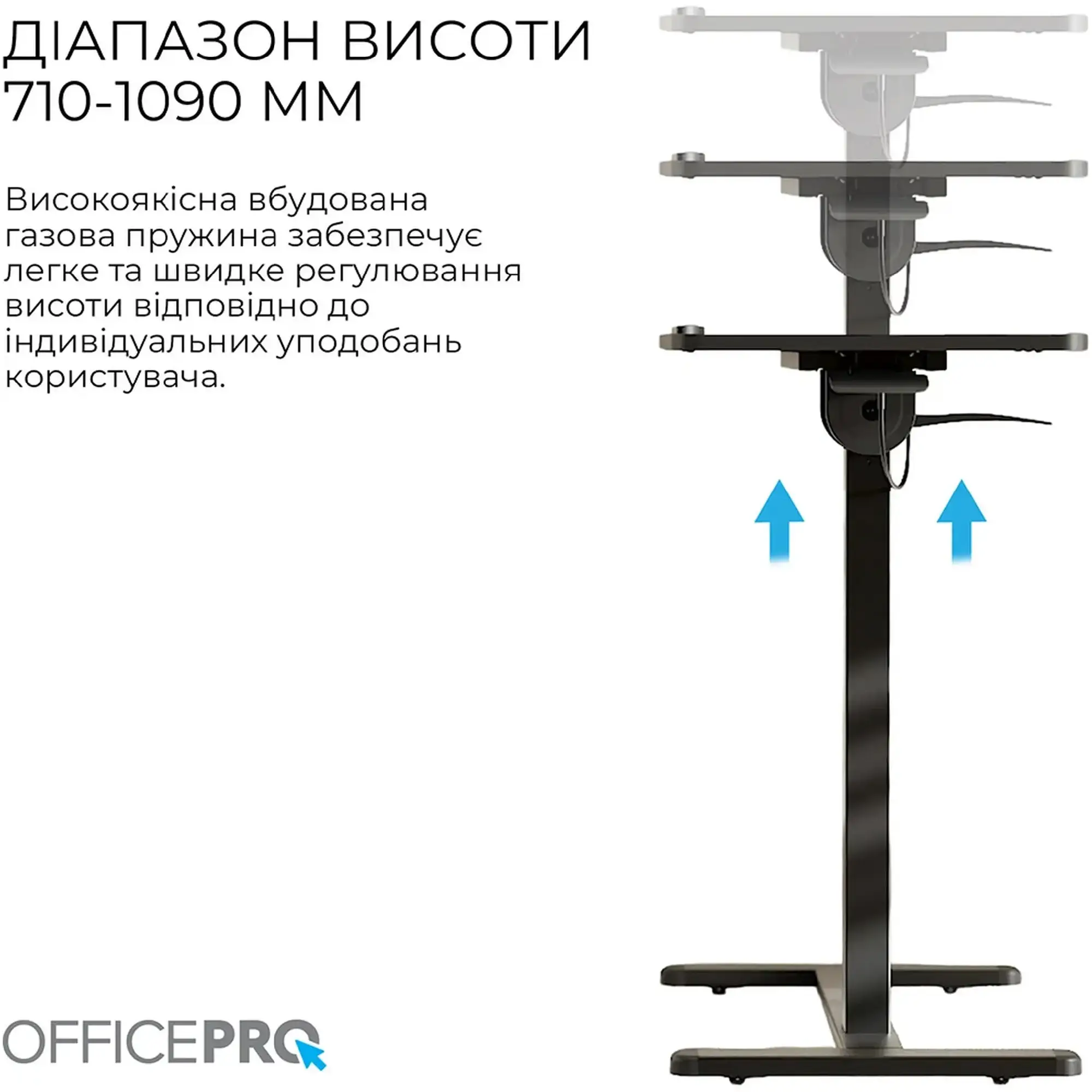 Диапазон механической регулировки высоты от 710 до 1090 мм обеспечивает возможность свободно переключаться между работой сидя и стоя. Такой подход помогает снизить нагрузку на позвоночник, улучшить осанку и поддерживать оптимальный уровень активности в течение рабочего дня. Благодаря плавному механизму подъёма стол легко подстраивается под разные варианты использования и предпочтения пользователя, делая работу более комфортной.