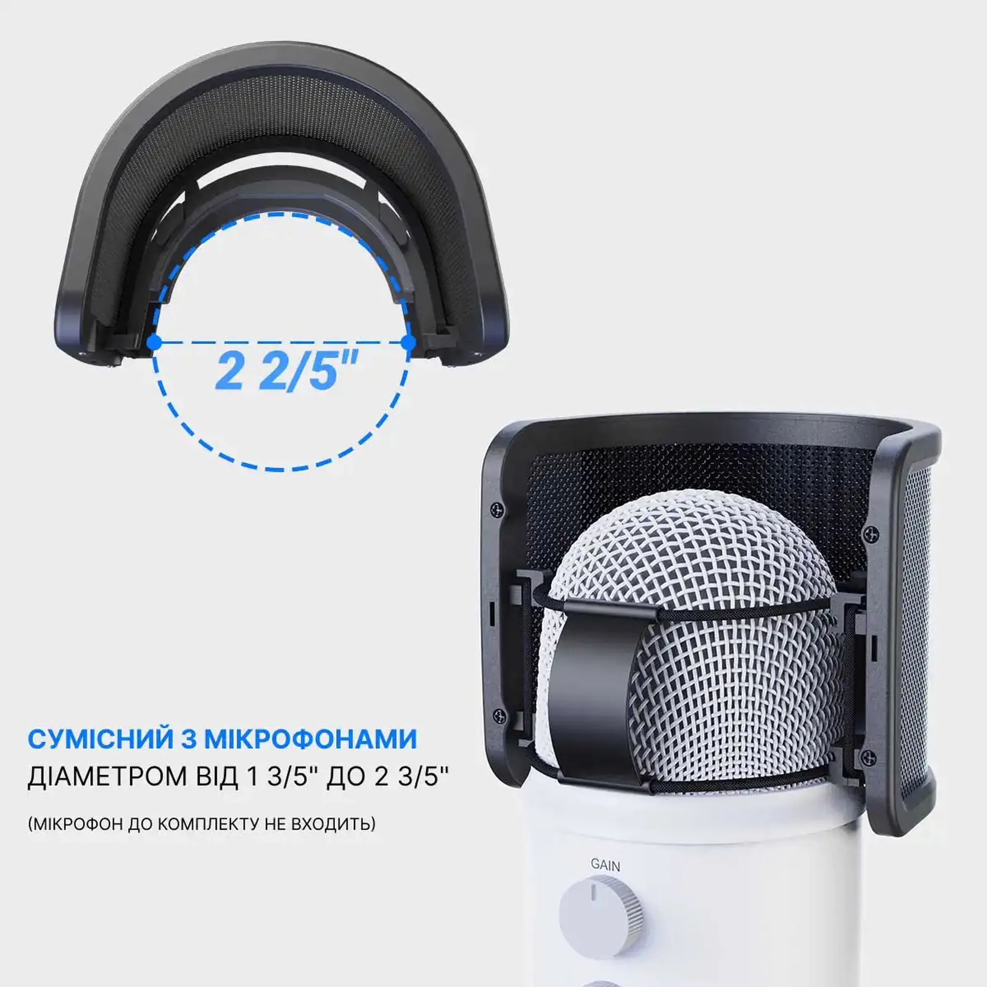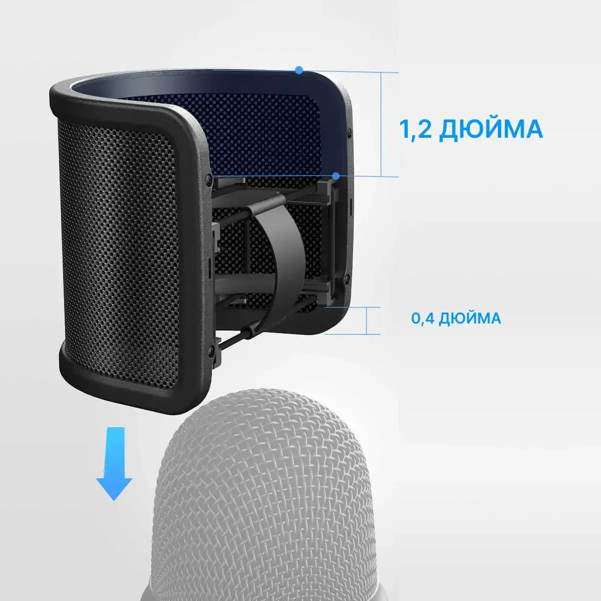Ключевой особенностью Fifine U1 Black является его совместимость с широким диапазоном микрофонов. Он подходит для моделей с диаметром от 40 мм до 70 мм, включая популярные модели Fifine K669/669B, K670/670B, K683A, K678, K690 и модели других производителей, такие как AT2020, AT2035, Blue Yeti, Blue Yeti Pro, HyperX Solocast, HyperX Quadcast. Это делает его универсальным решением, которое можно использовать с большинством микрофонов на рынке. Благодаря своей конструкции, поп-фильтр эффективно снижает воздушные потрескивания и фрикции, обеспечивая чистоту и четкость записи.