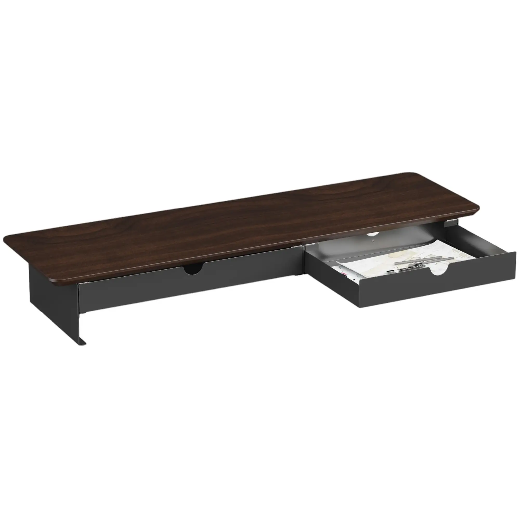 Конструкция основана на прочной стальной раме, которая гарантирует устойчивость и долговечность навіть при длительном использовании. Деревянная столешница толщиной 15 мм выполнена в стильном сочетании темного дерева и черного цвета, что подчеркивает современный характер модели. Благодаря оптимальной высоте 12,4 см столик способствует более комфортной посадке и снижению нагрузки на шею и плечи.