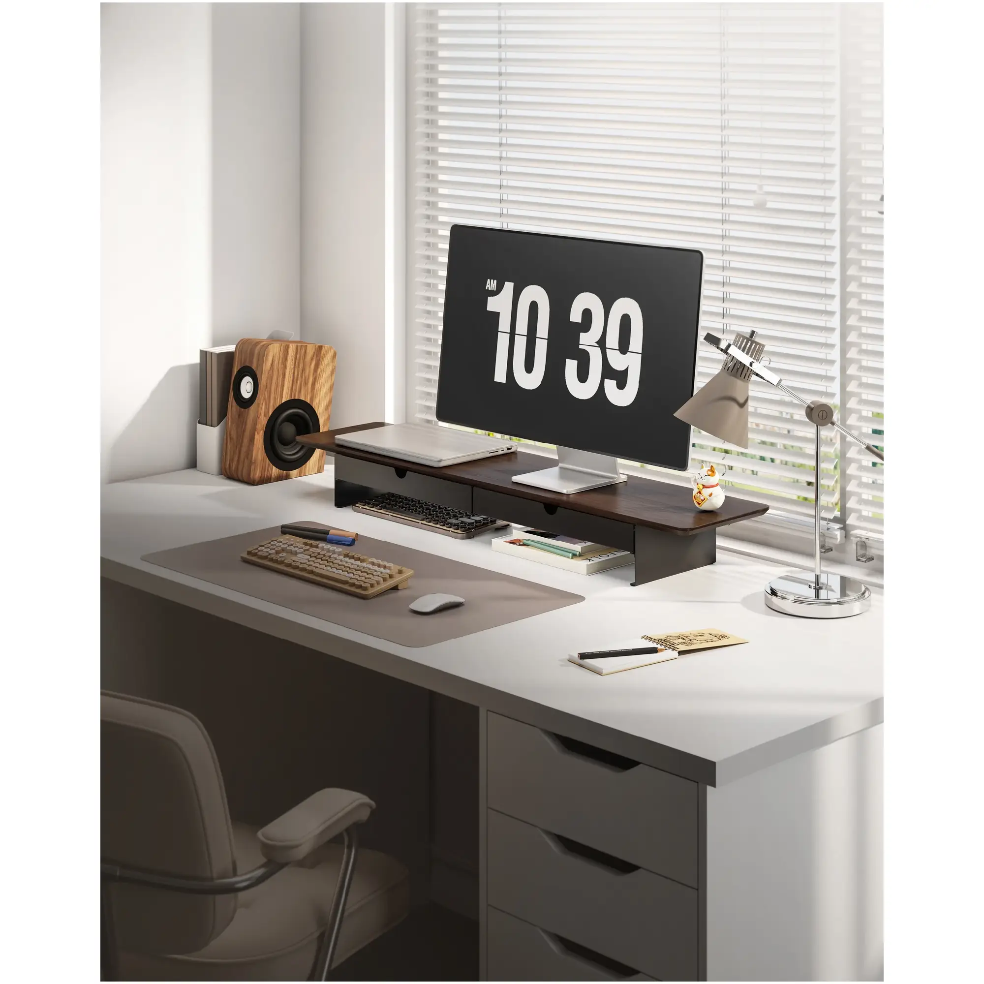 Гармоничное сочетание цветов Dark Wood/Black формирует современный внешний вид, благодаря которому столик вписывается в любой интерьер — от минималистичного офиса до домашнего рабочего уголка. Размеры 1060×240×124 мм позволяют эффективно разместить аксессуар даже на небольшом столе, создавая дополнительное пространство для организации рабочей поверхности.