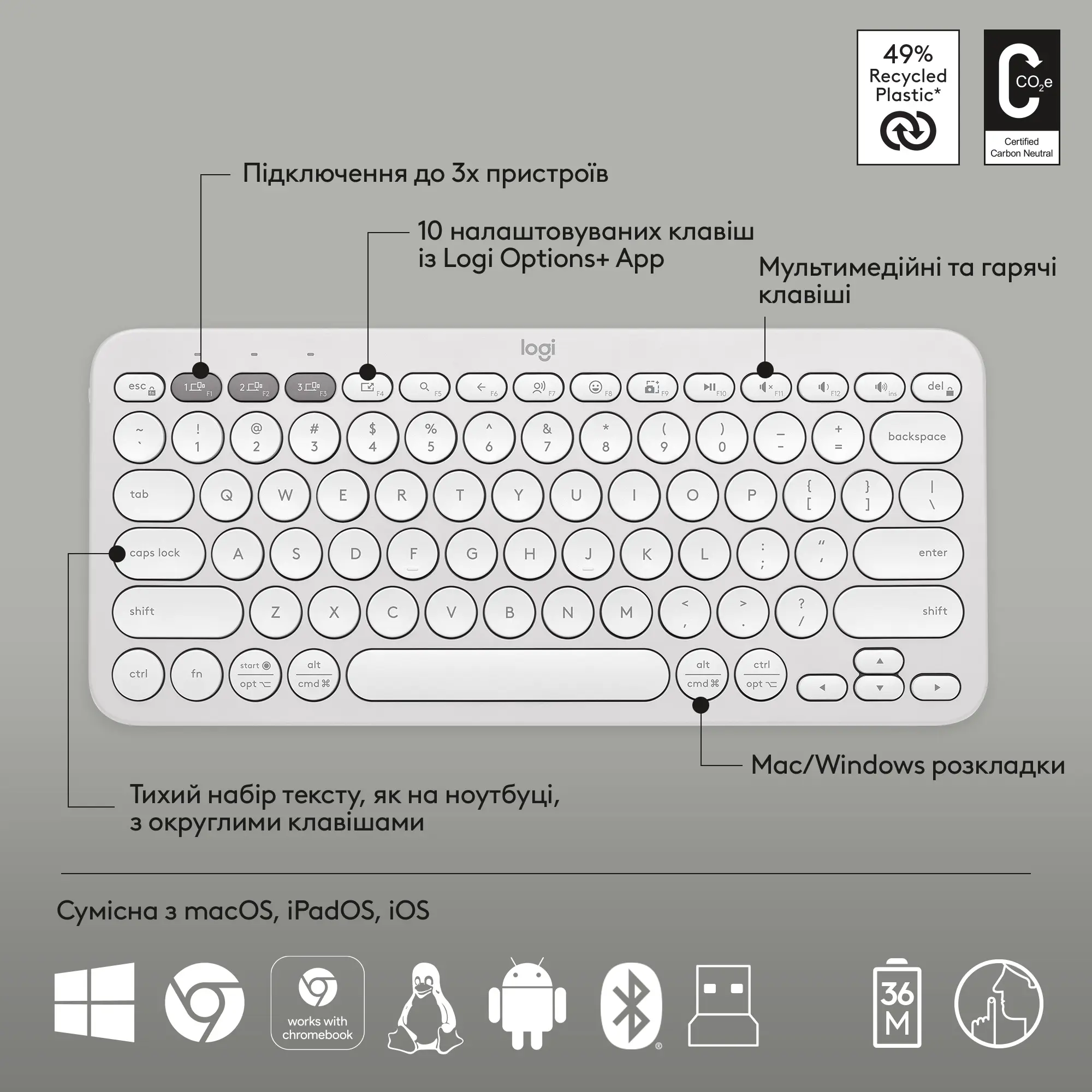 Легкий и портативный дизайн позволяет без труда поместить клавиатуру и мышь в сумку, не занимая много места. Особенность клавиатуры – возможность переключения между тремя устройствами с помощью кнопок Easy-Switch, что обеспечивает удобство использования в многозадачной среде. Комплект совместим с множеством операционных систем, включая Windows, MacOS, iPadOS, iOS и Android, что делает его универсальным решением для различных типов устройств.