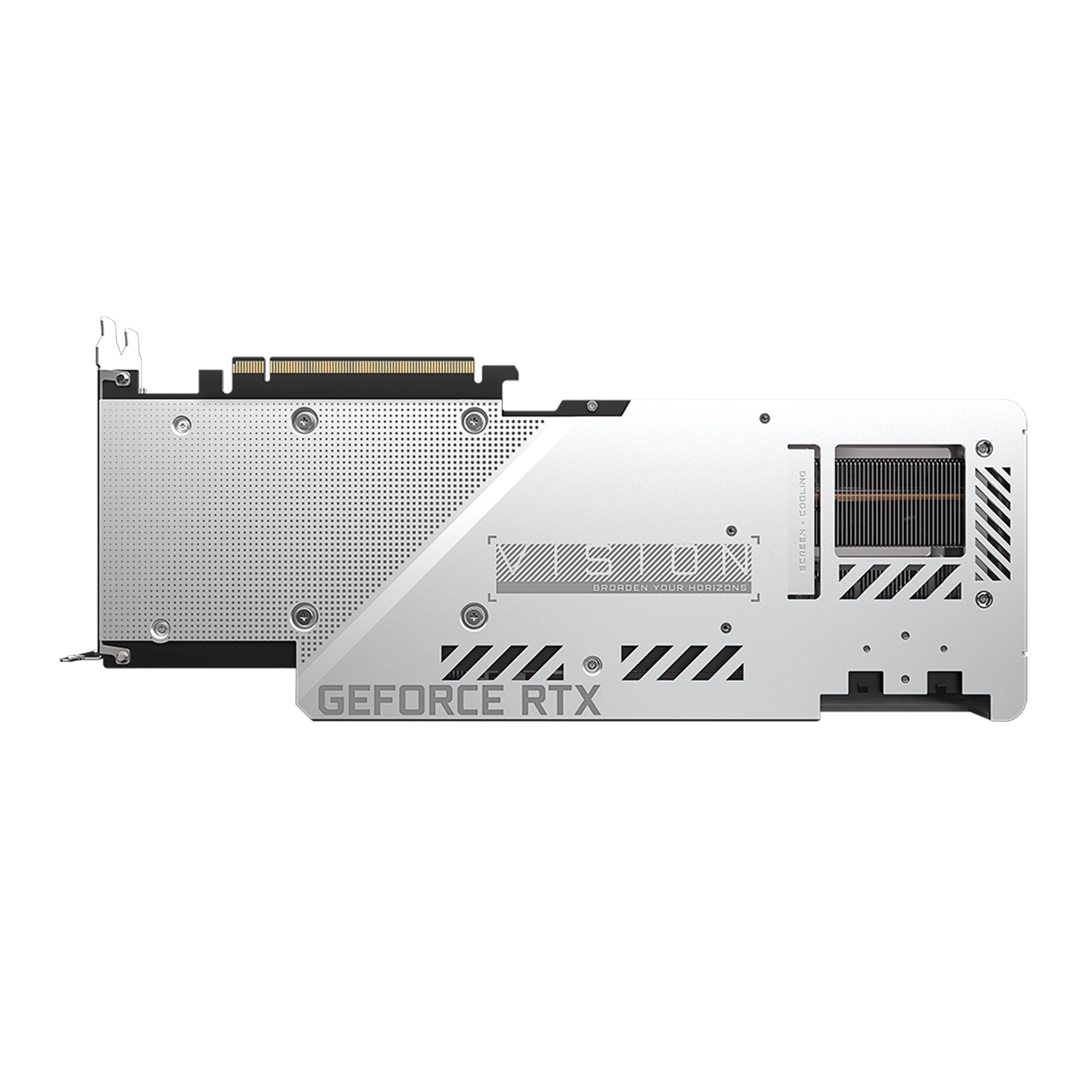 - Задняя часть печатной платы накрыта металлическим бэкплейтом, который надежно защищает видеокарту от возможных повреждений и минимизирует нагрузки на изгиб и кручение. Весь корпус выполнен в концептуальном дизайне VISION, который подчеркивает мощность устройства.