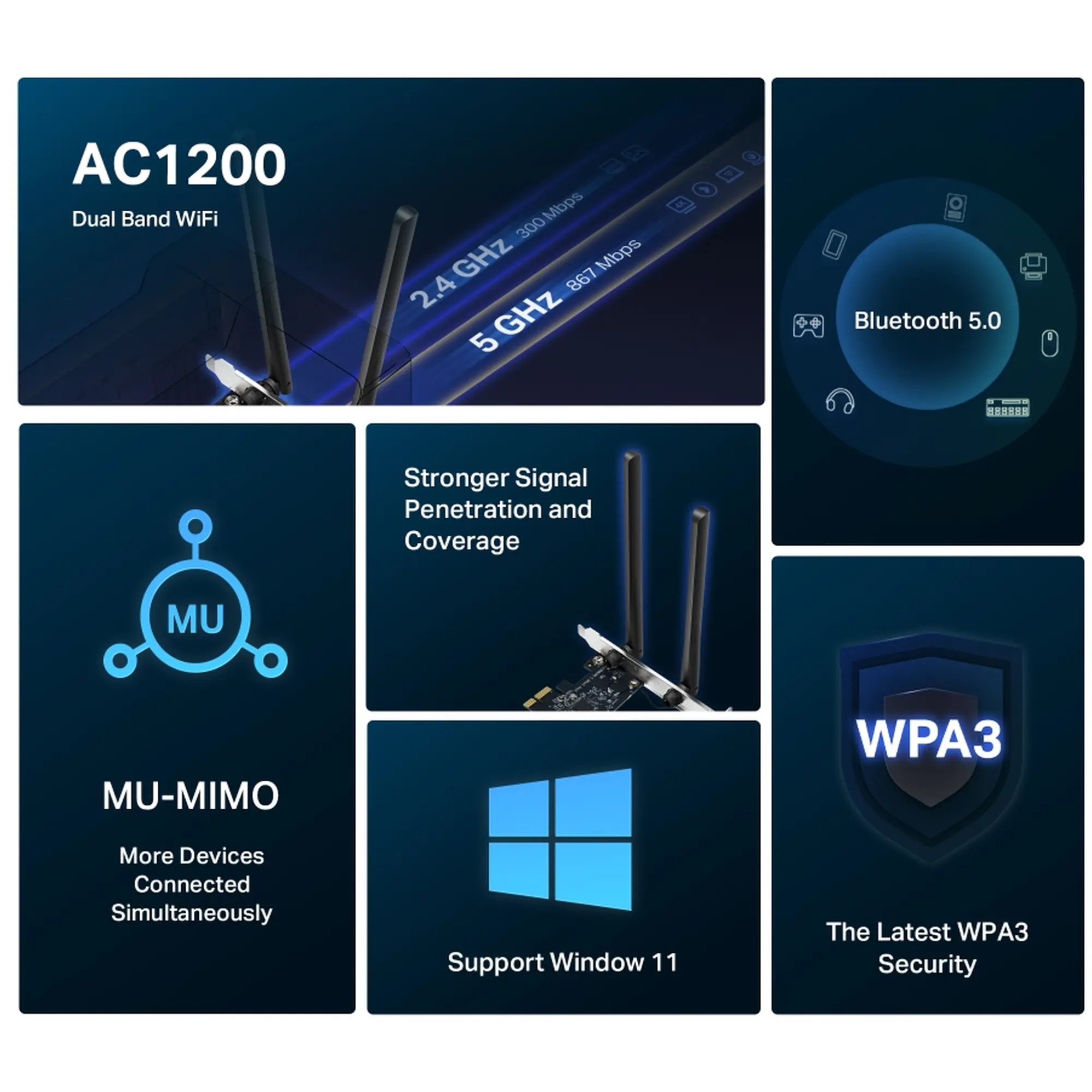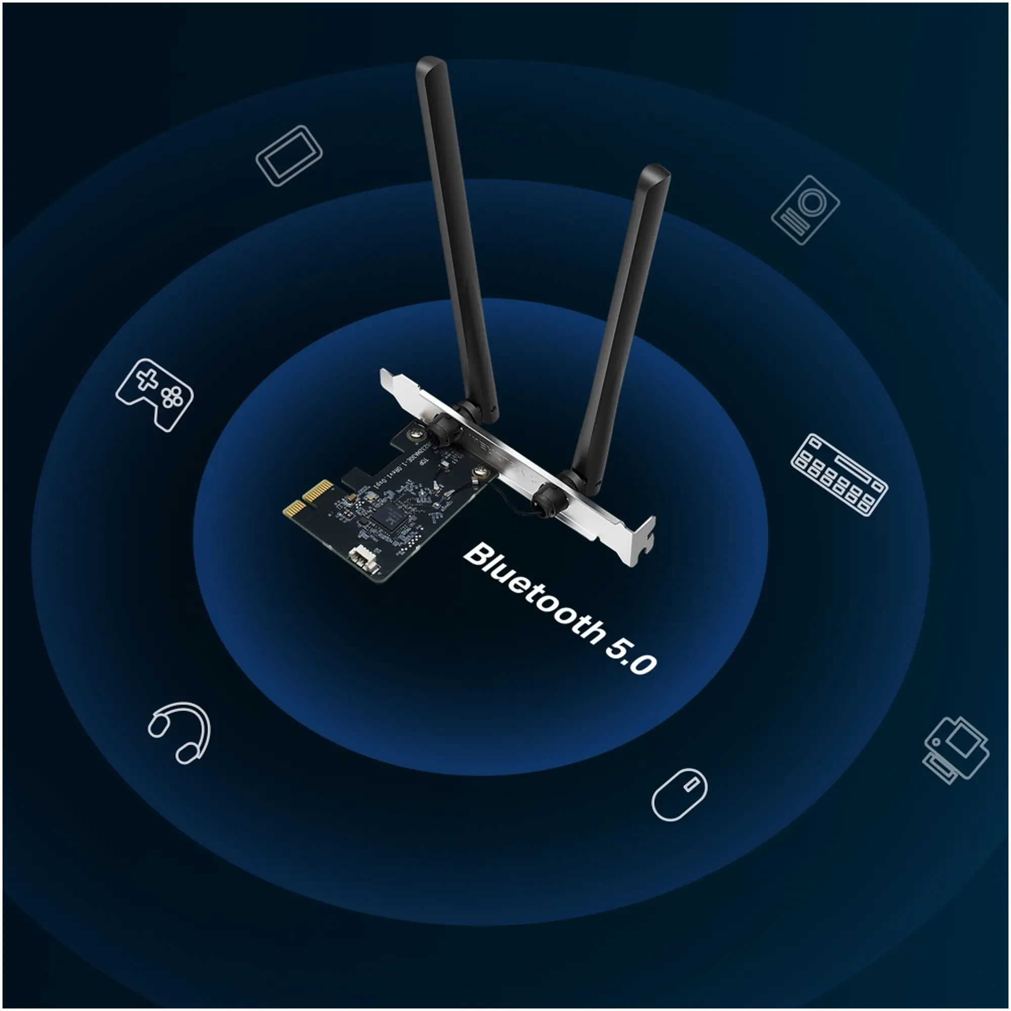 Mercusys AC1200 (MA30E) оснащён двумя встроенными антеннами высокой мощности, которые обеспечивают надёжный приём и передачу сигнала даже на значительном расстоянии от маршрутизатора. Технология MU-MIMO повышает эффективность сети, позволяя адаптеру взаимодействовать с несколькими устройствами одновременно без снижения скорости. Кроме того, поддержка Bluetooth 5.0 превращает ПК в универсальный центр подключения беспроводных аксессуаров — гарнитур, мишей, клавиатур и геймпадов.