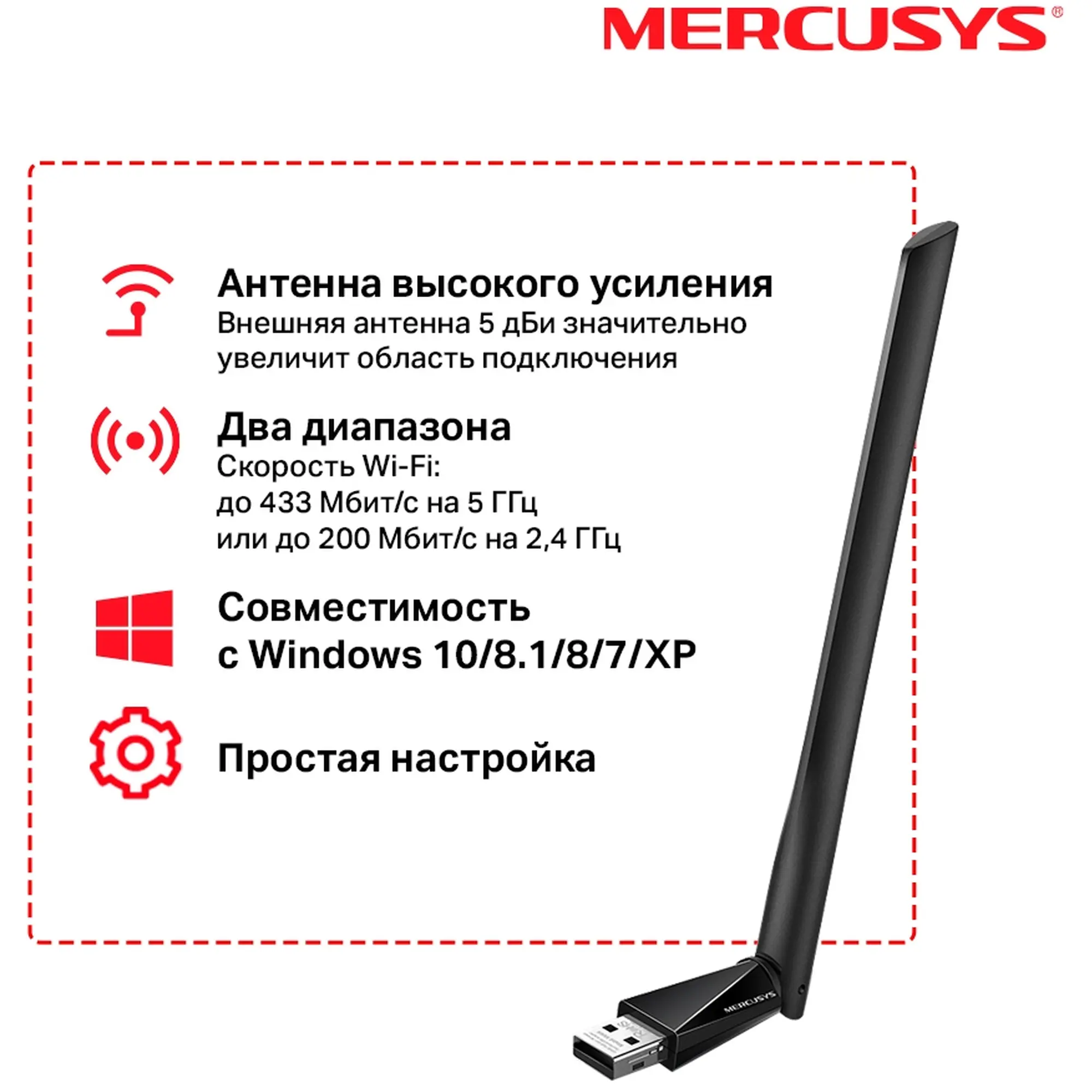 Установка Mercusys AC650 (MU6H) максимально проста — встроенный драйвер автоматически активируется при подключении к Windows, что позволяет начать работу буквально за несколько секунд. Благодаря регулируемой антенне пользователь может легко изменить направление сигнала, добиваясь оптимального уровня связи в любых условиях. Устройство полностью совместимо с системами Windows 10 и 11 (32/64 бита), что делает его универсальным решением для ноутбуков и настольных ПК.