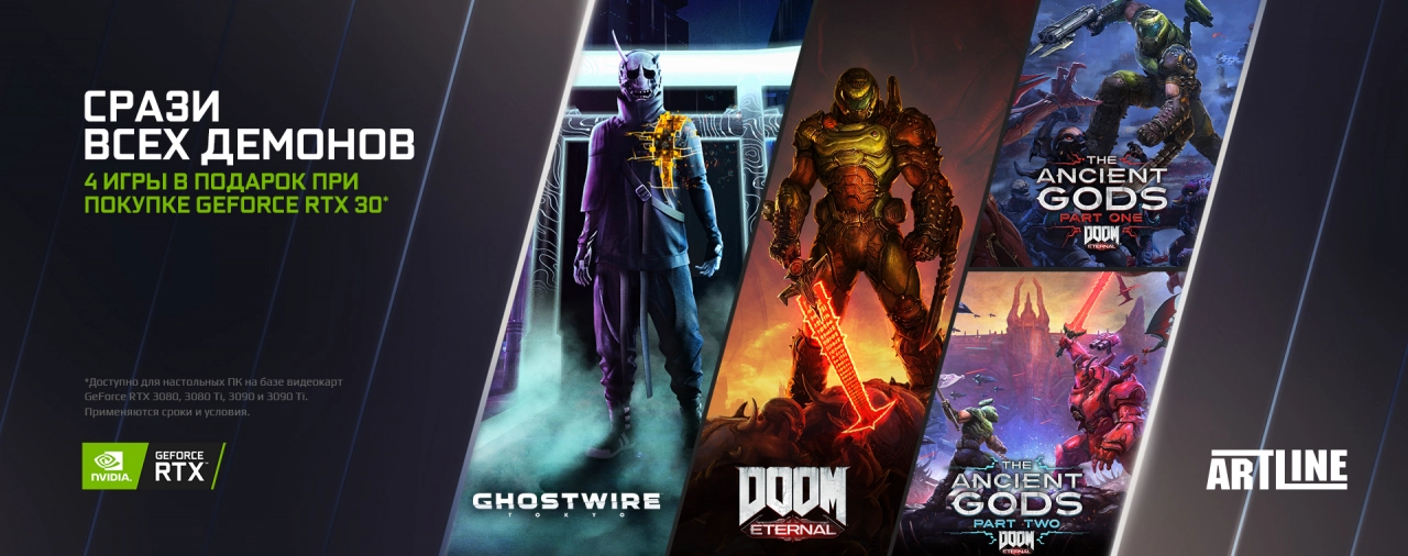 Каждый покупатель ПК Artline с топовыми GeForce RTX 3080/3080 Ti/3090/3090 Ti получит игры Games: Ghostwire: Tokyo и Doom Eternal с боевым пропуском и дополнением