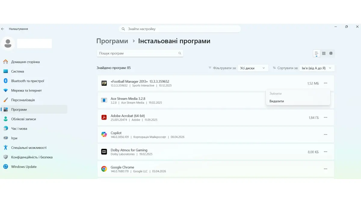 Перший крок – використання меню «Параметри» (потім потрібно вибрати «Програми» й «Інстальовані програми», три крапки та «Видалити») або класичної «Панелі керування». Це базове видалення, яке запускає скрипт, написаний самим розробником застосунку. Проблема в тому, що багато розробників навмисно залишають у системі ваші налаштування та ліцензійні ключі «на майбутнє». У результаті очищення системи відбувається лише частково.